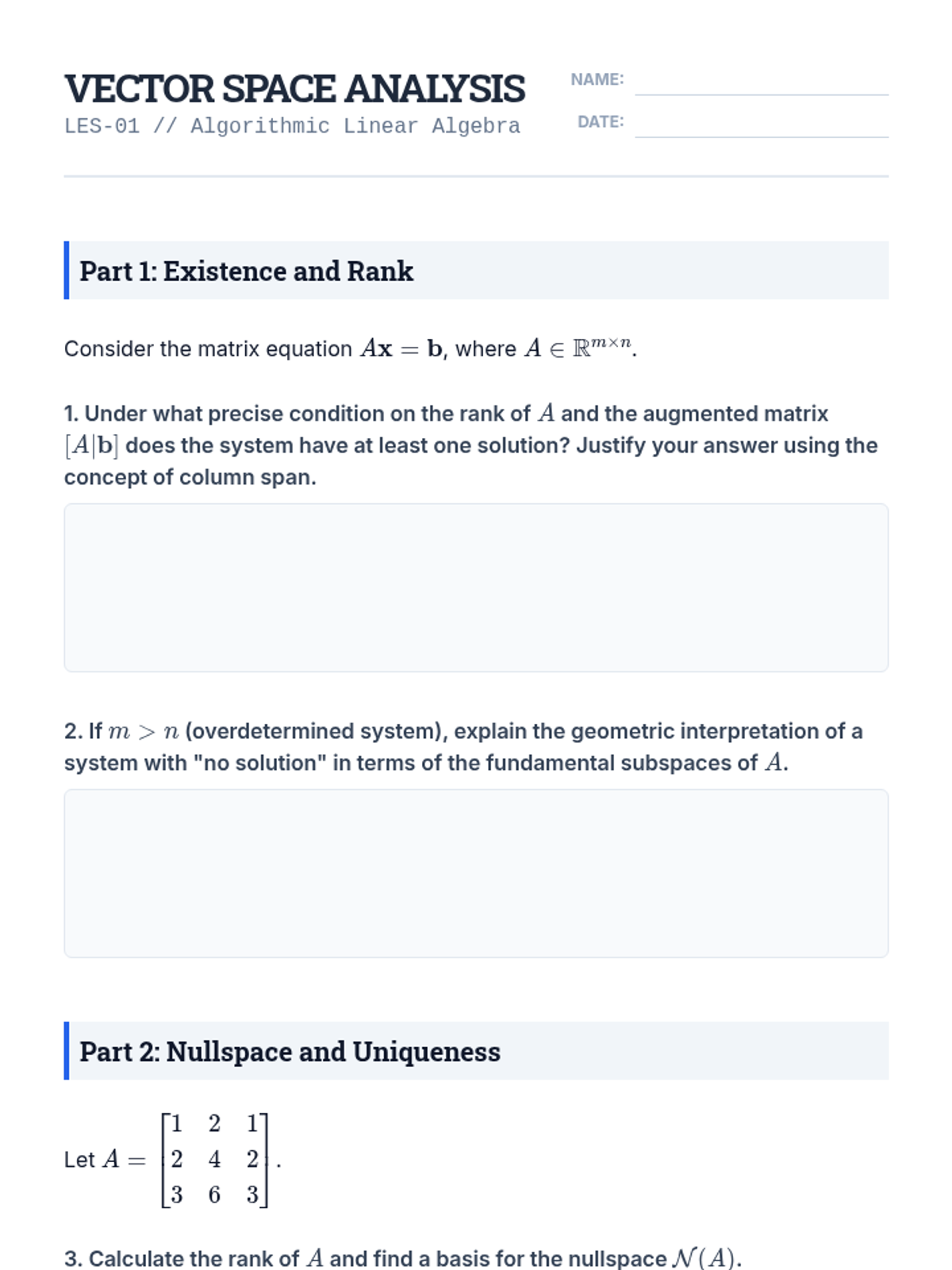 This advanced sequence explores systems of linear equations through the lens of computational linear algebra. Graduate students will move from theoretical existence and uniqueness in vector spaces to matrix factorizations, algorithmic complexity, numerical stability, and iterative methods for large-scale systems.