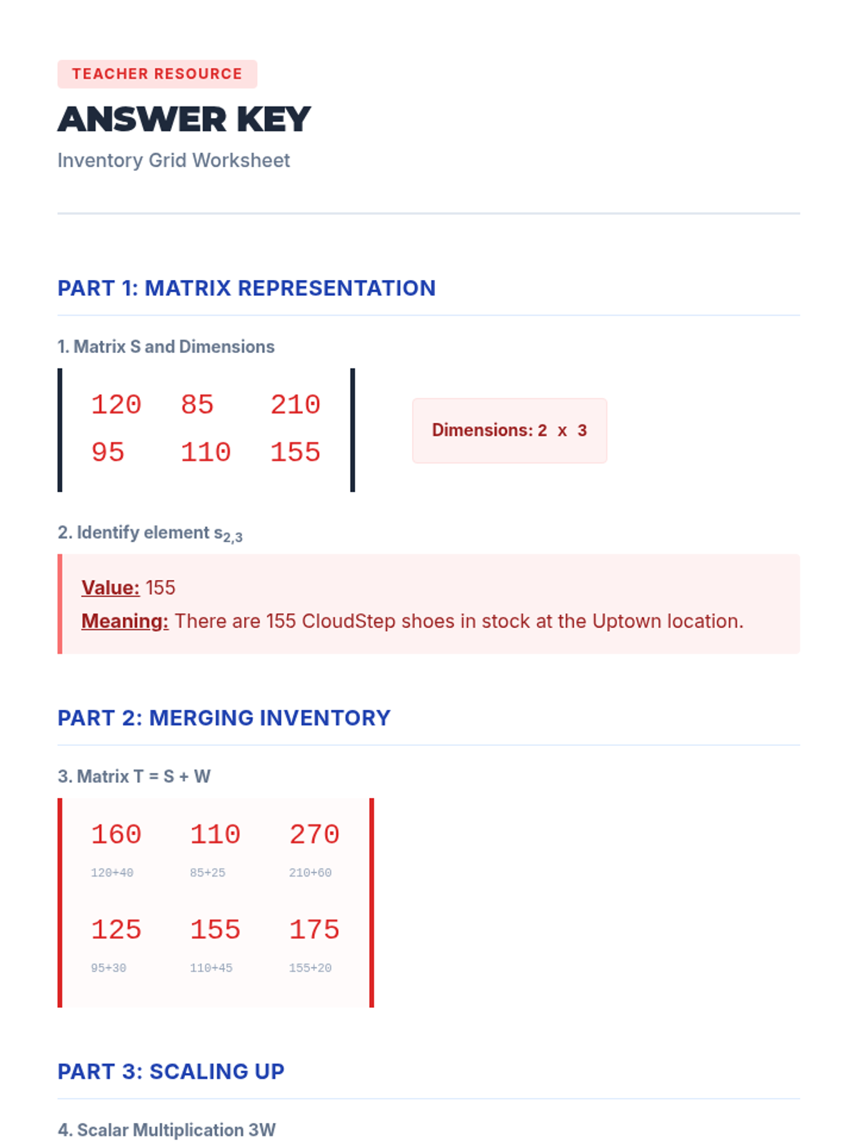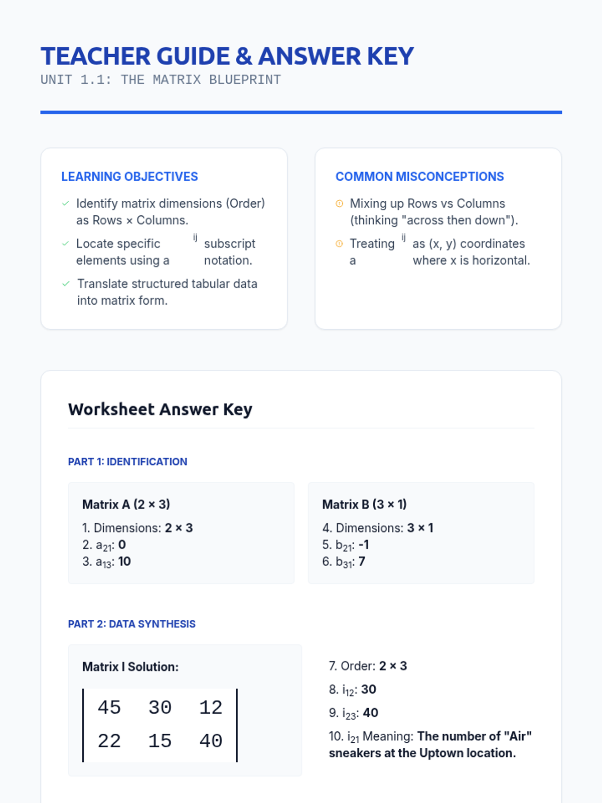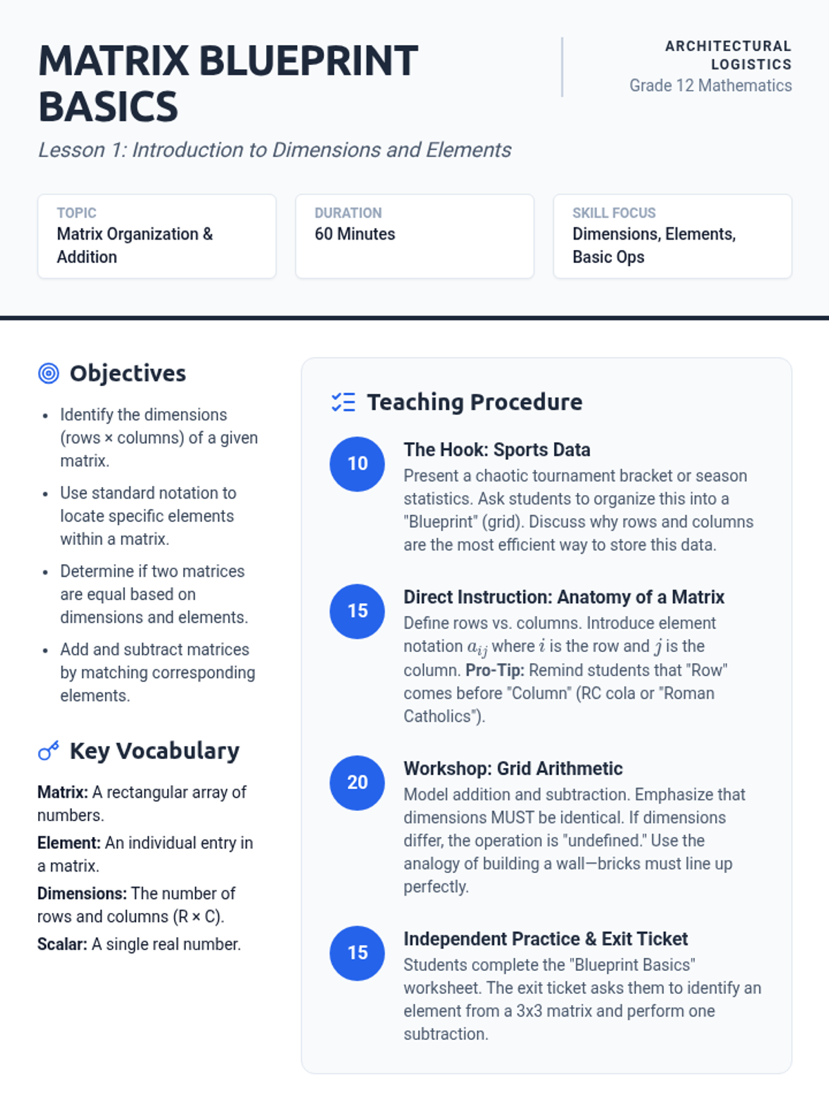 A comprehensive unit for 10th-grade students exploring matrix operations, from basic dimensions and notation to complex multiplication and real-world applications in inventory management.