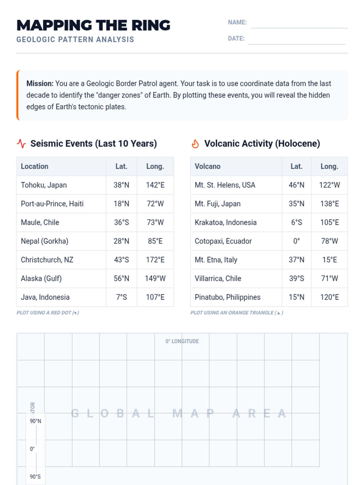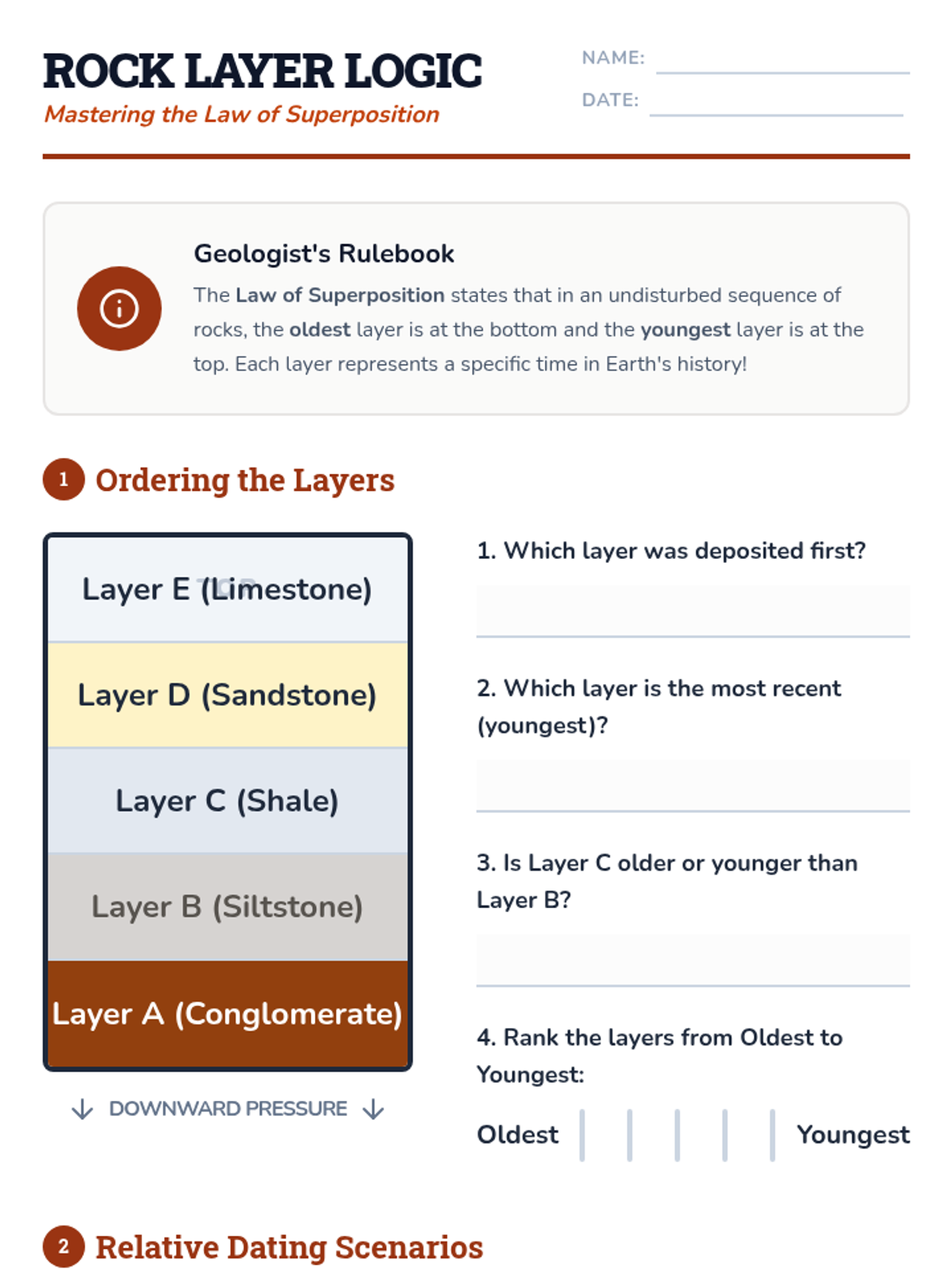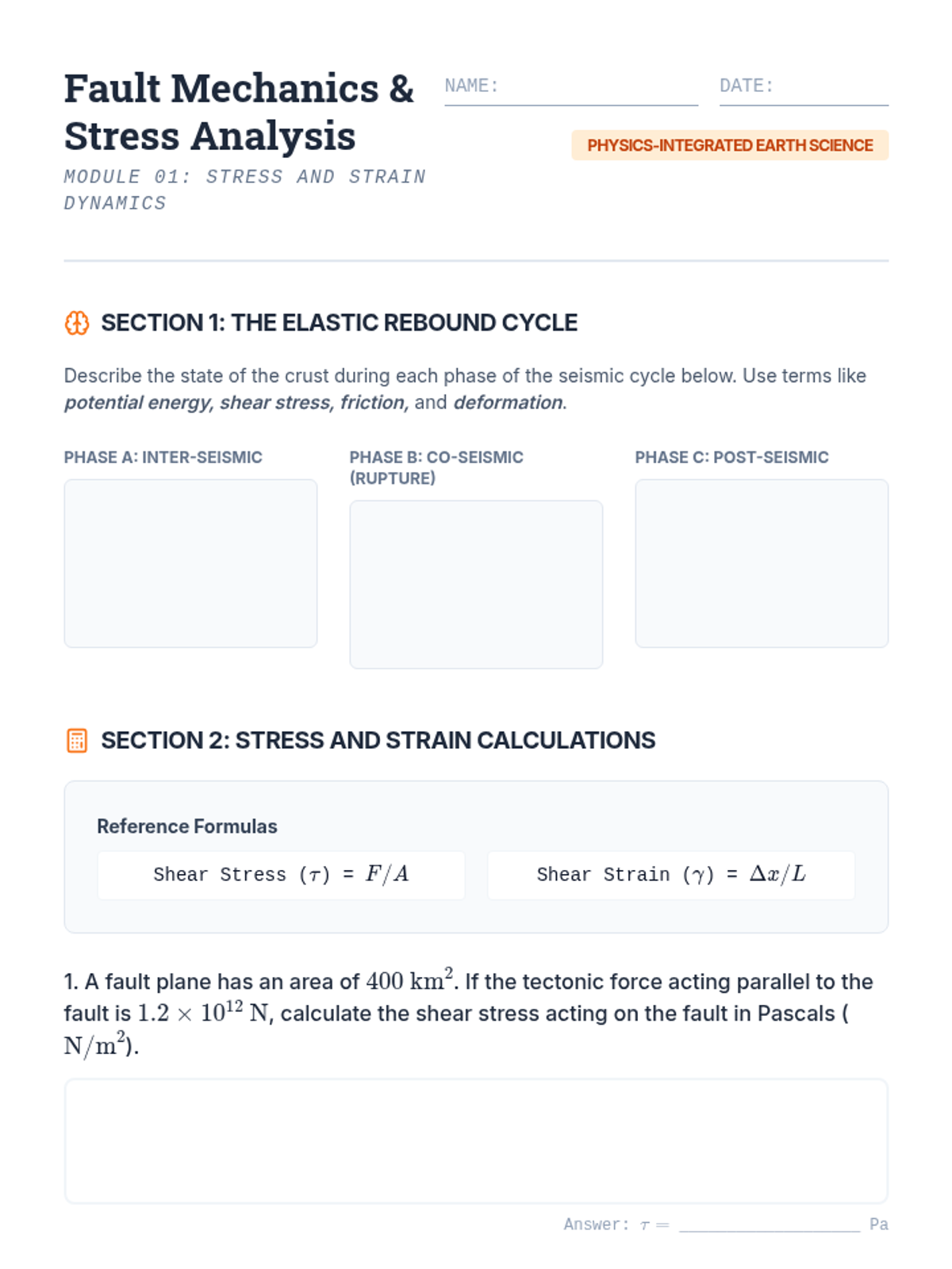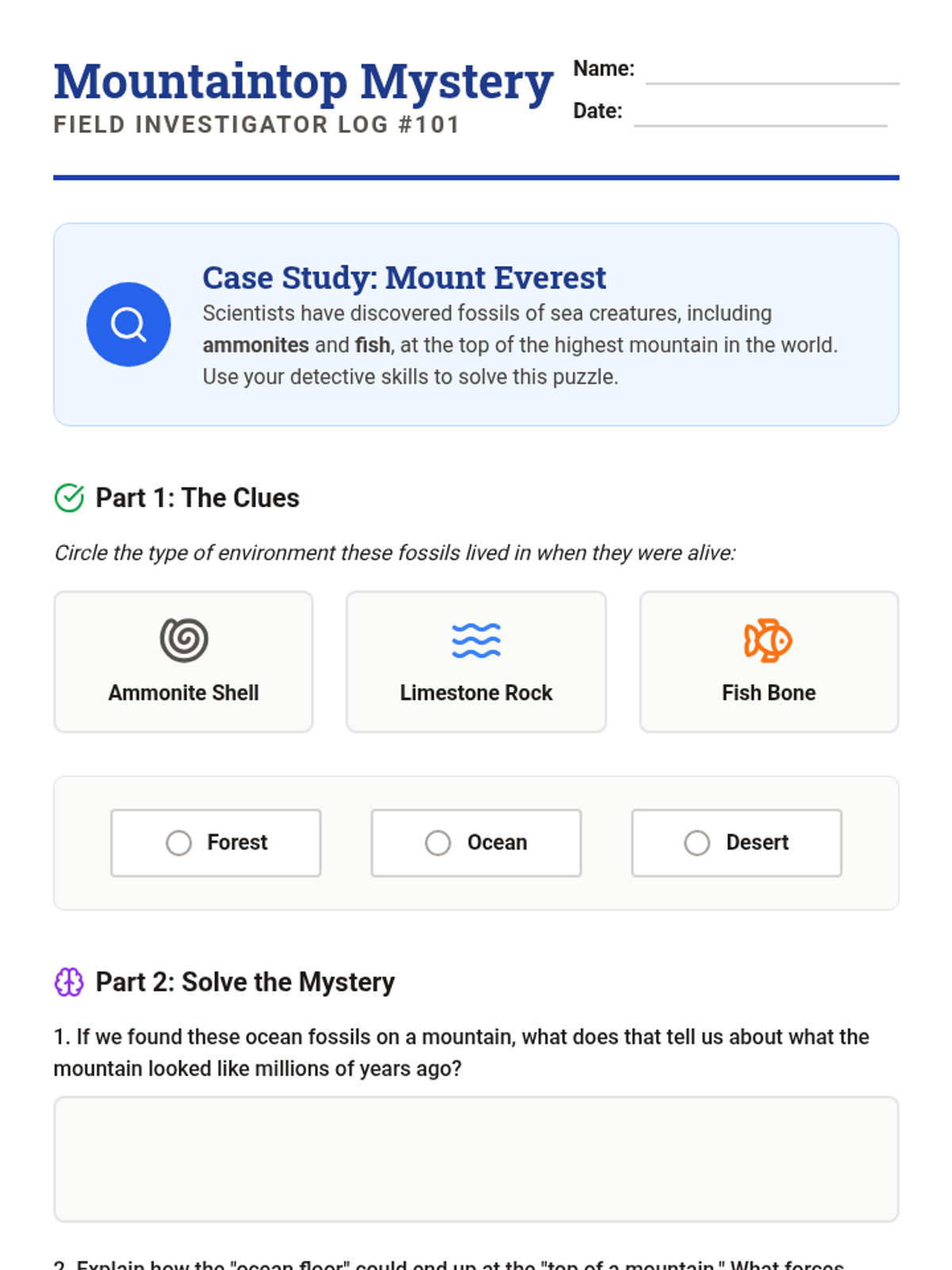 Geological processes including plate tectonics, rock formation, and Earth's structure alongside atmospheric weather systems and fossil records. Examines human environmental impacts, resource management, and celestial bodies within the field of astronomy.