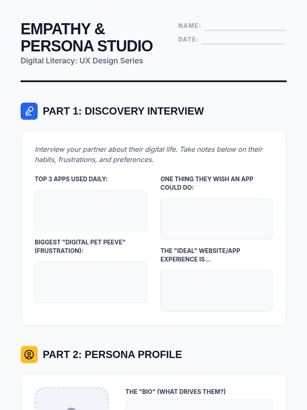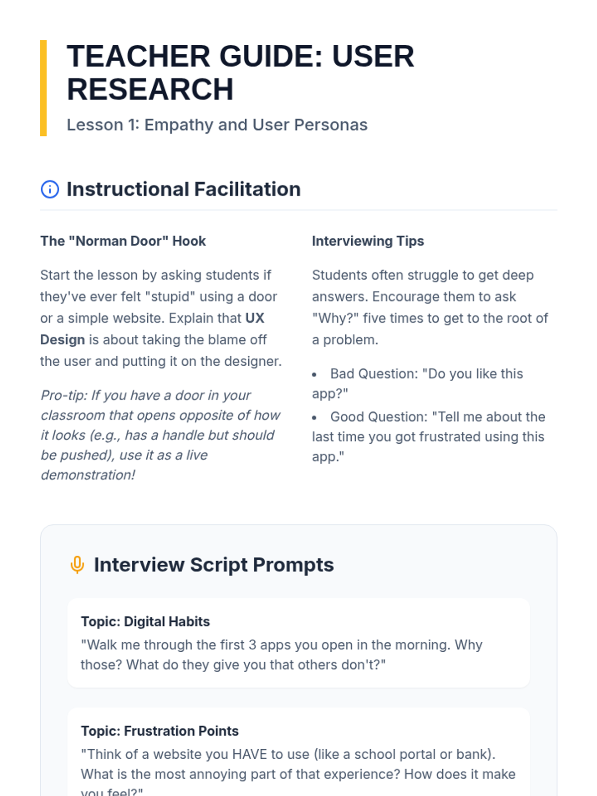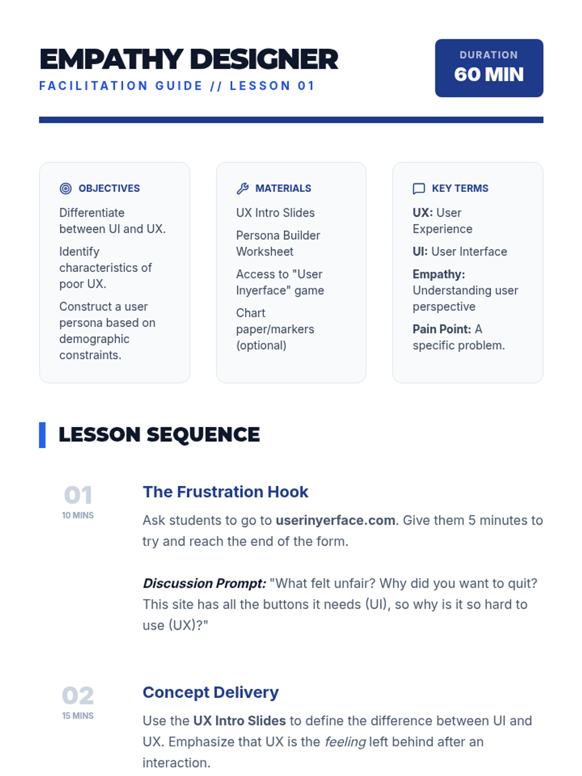 A comprehensive unit on User Experience (UX) and User Interface (UI) design for 7th grade students. Students move from analyzing website usability to wireframing and testing their own paper prototypes, focusing on empathy, information architecture, and iterative design.