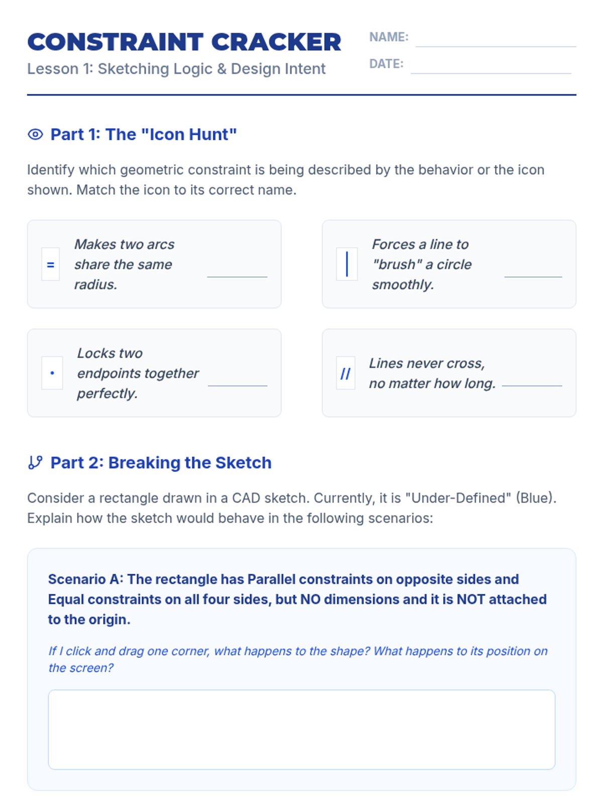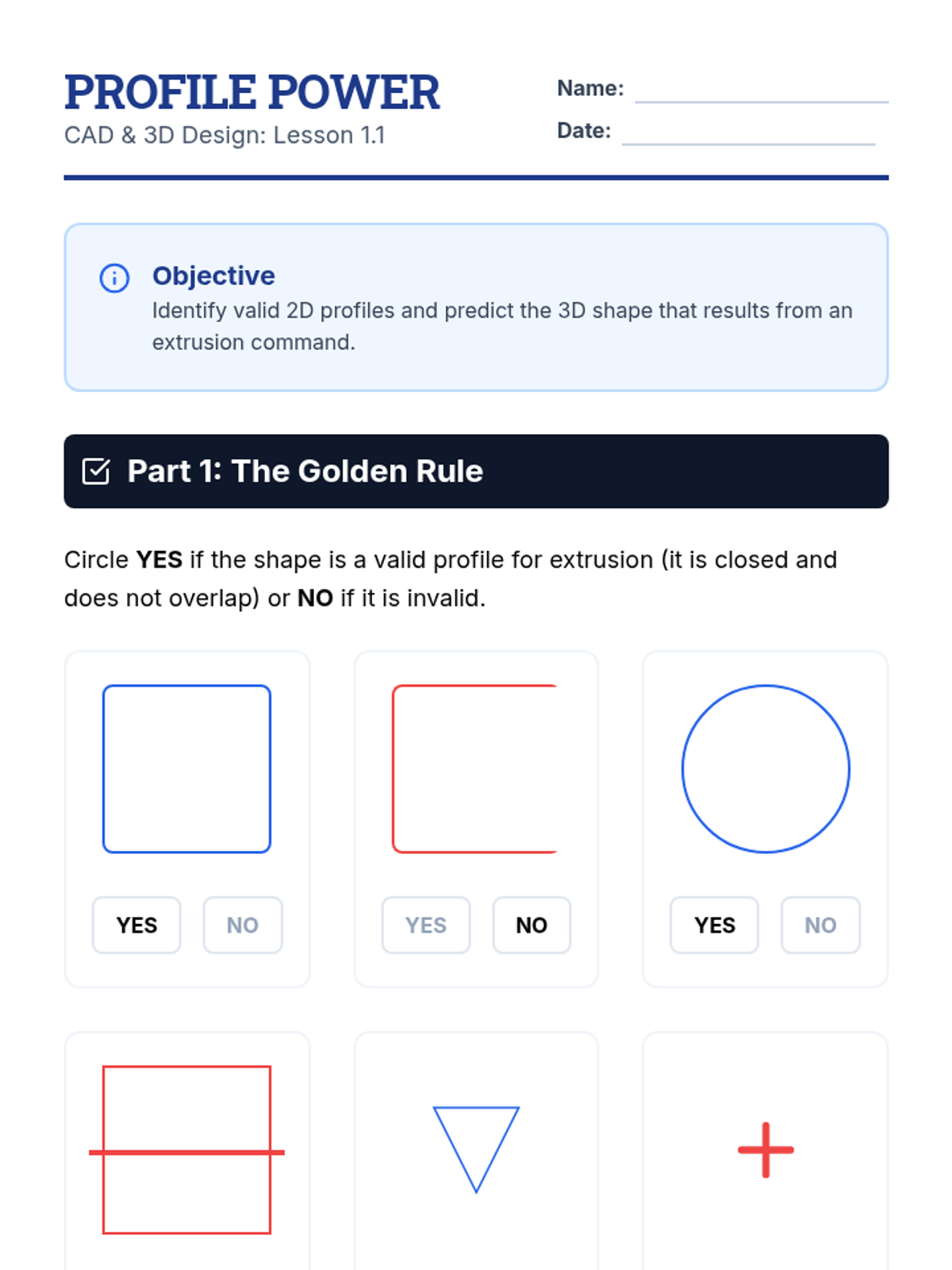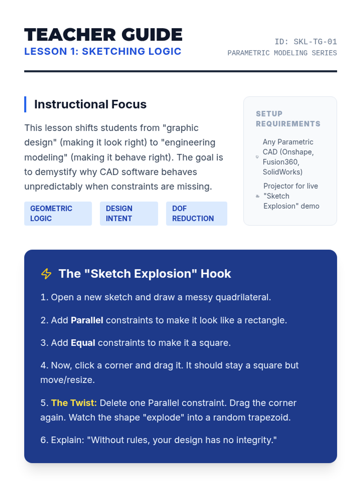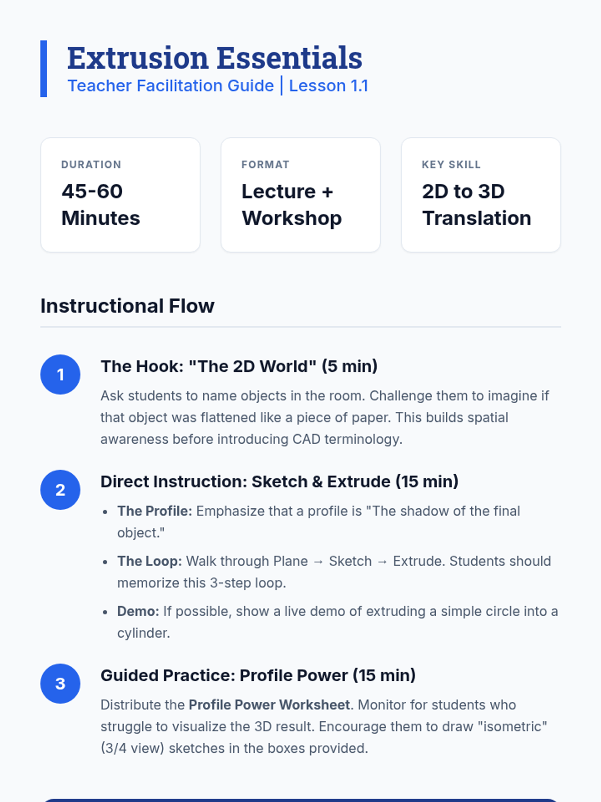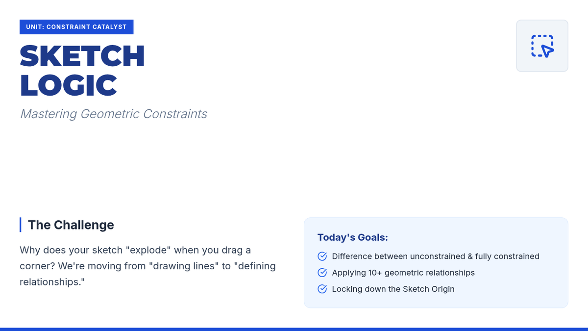 A comprehensive introduction to parametric CAD modeling for 11th-grade students. This sequence covers 2D sketching with geometric constraints, 3D feature creation (extrude, revolve, loft, sweep), and advanced part refinement, culminating in a parametric design challenge.