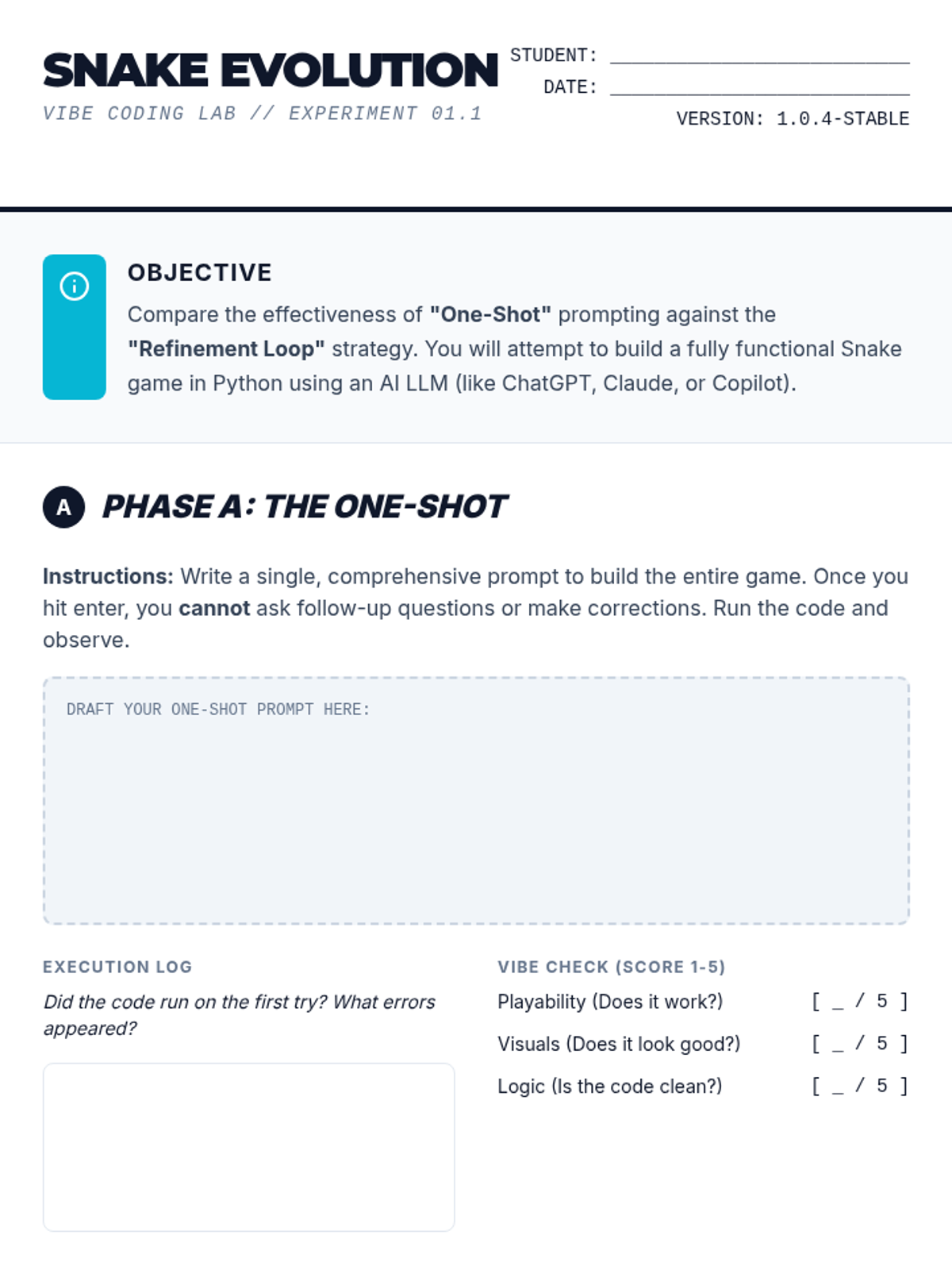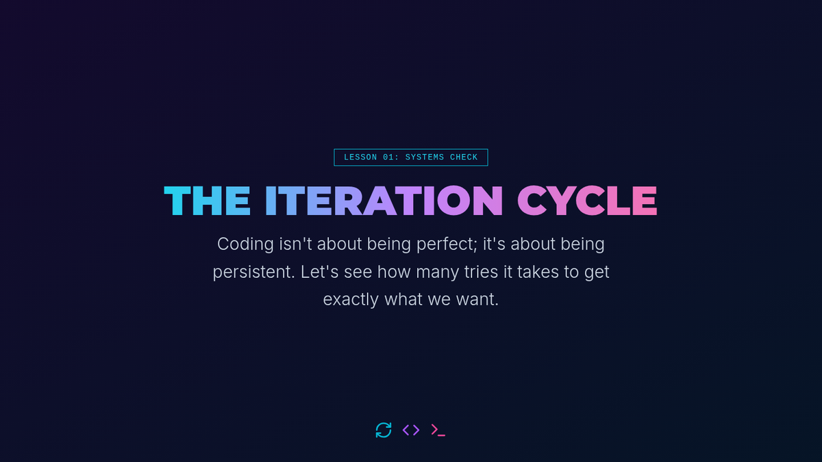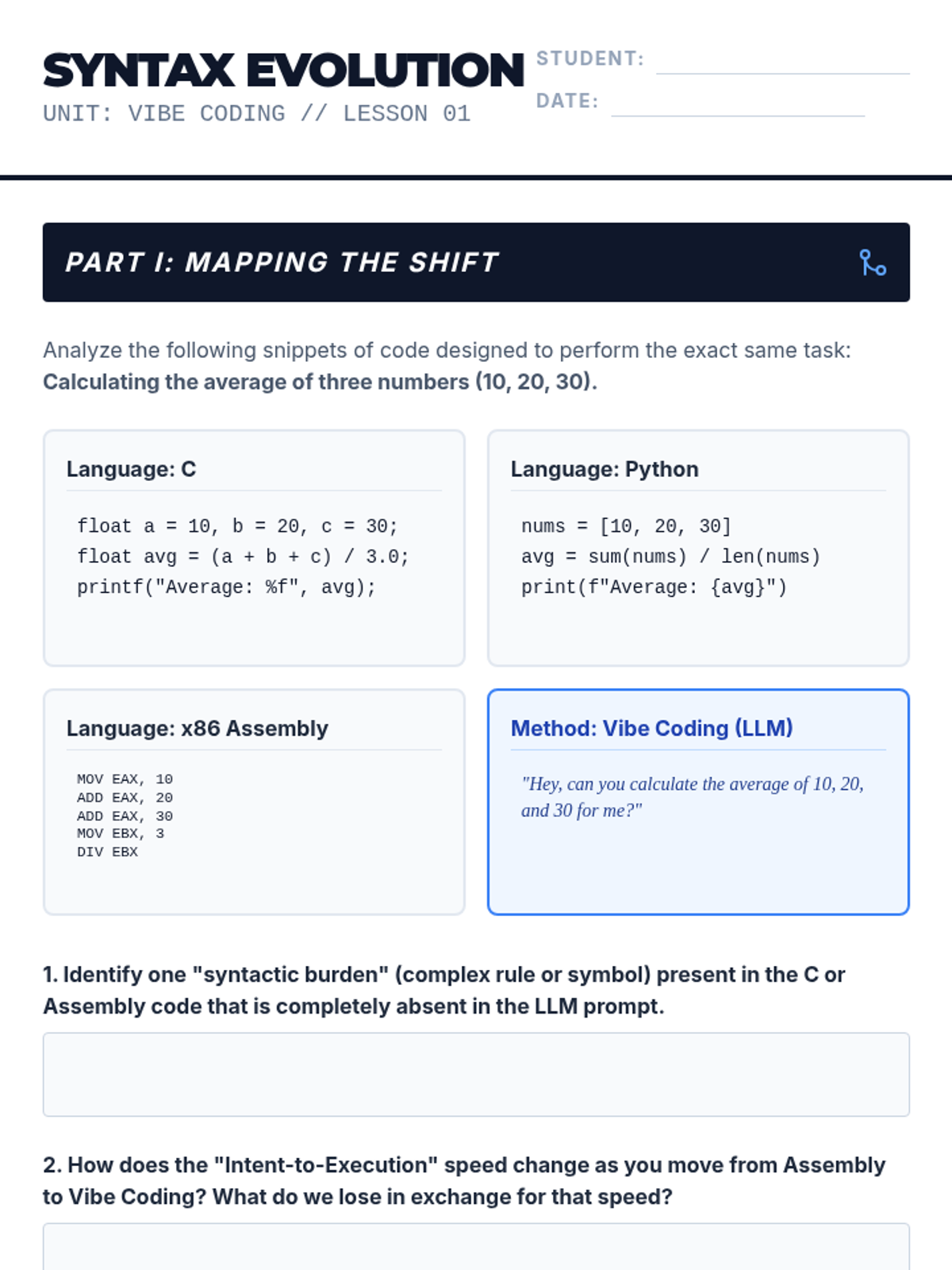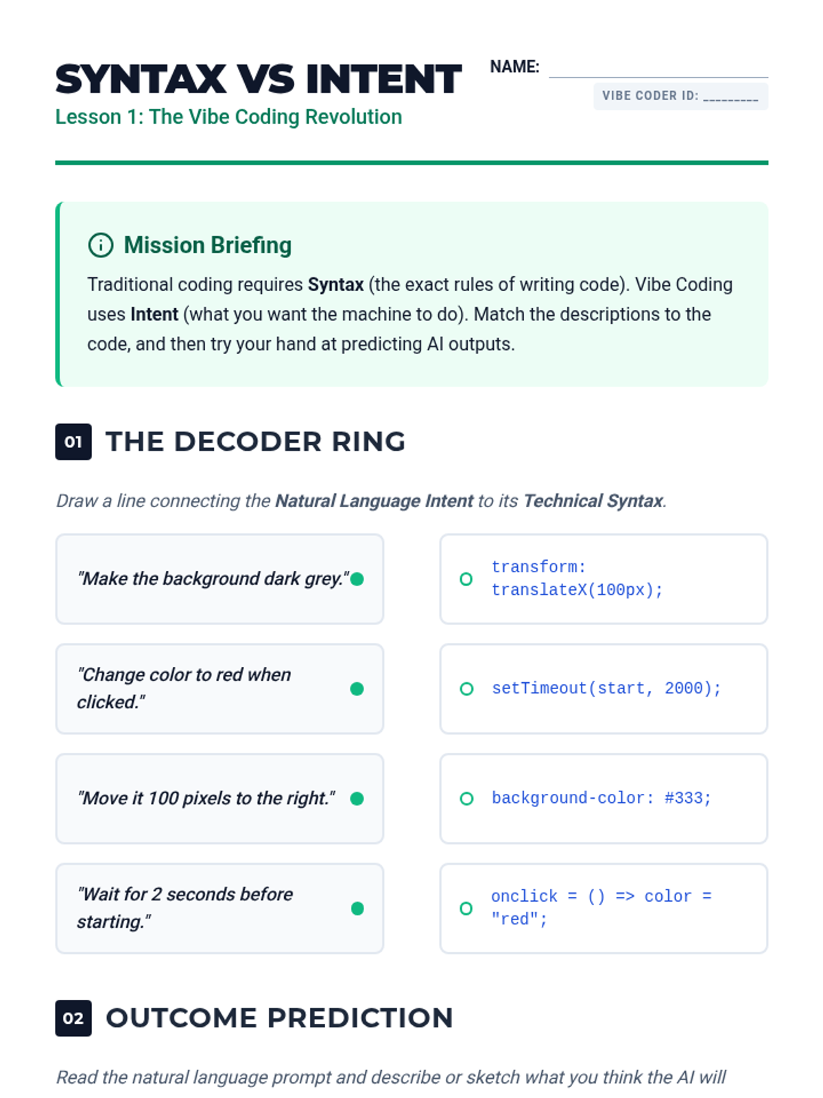 This introductory sequence establishes the foundational concepts of 'vibe coding'—programming via natural language descriptions rather than manual syntax entry. Students explore how Large Language Models (LLMs) interpret intent to generate code, comparing traditional coding workflows with AI-assisted development.