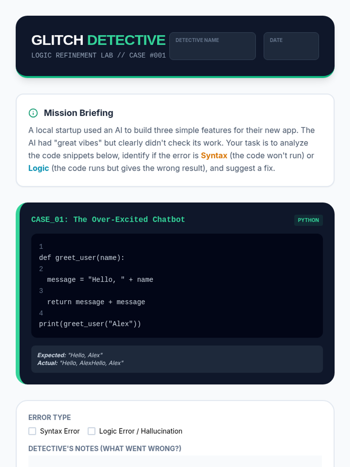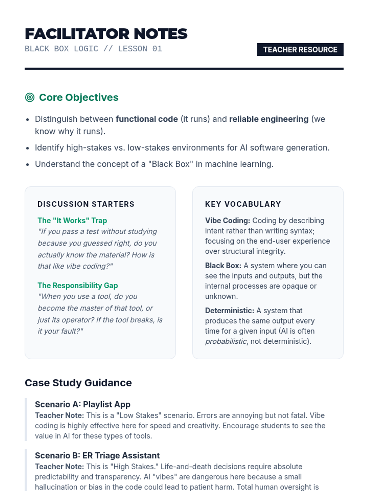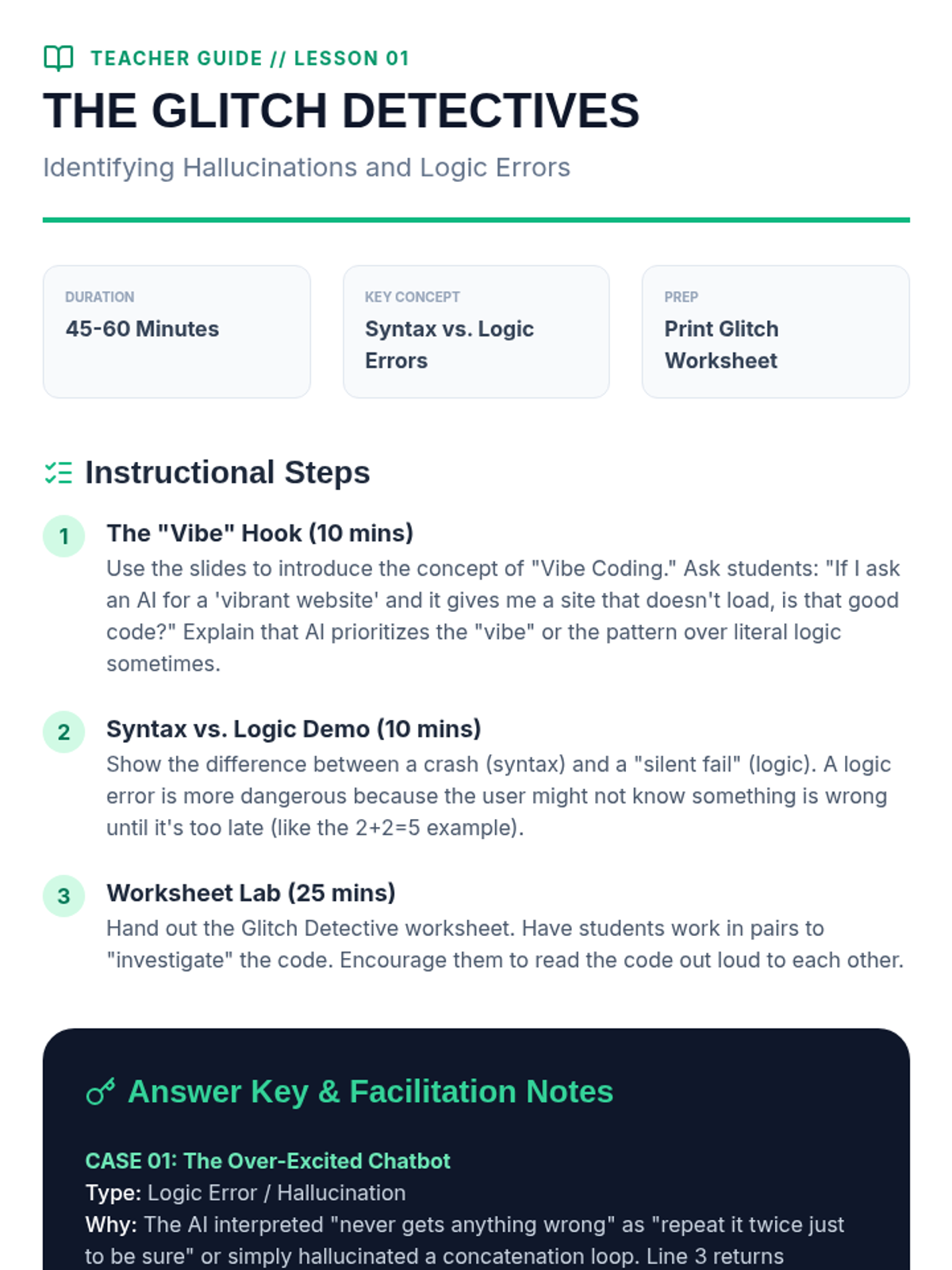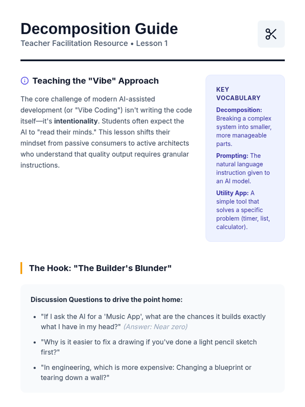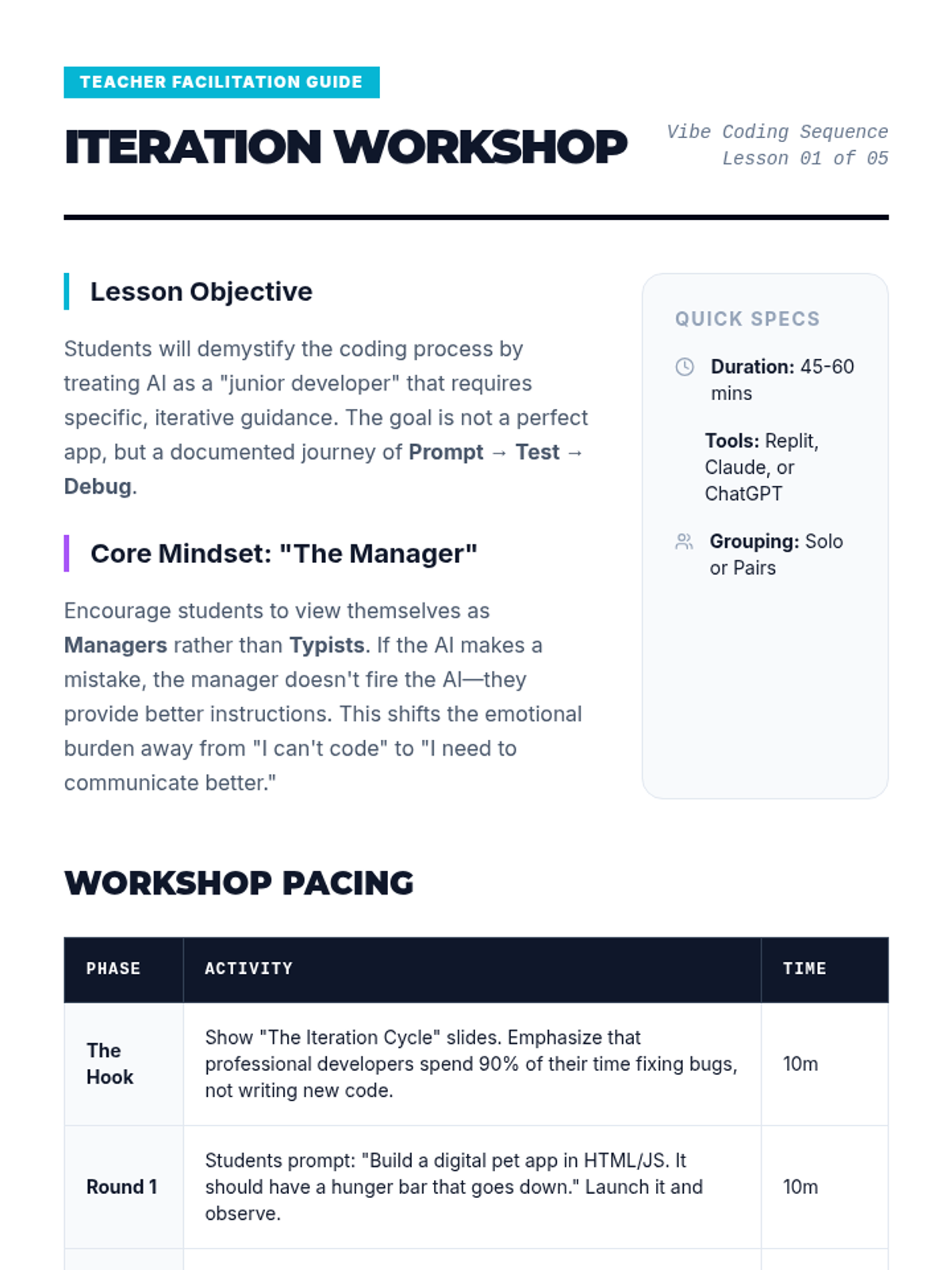 A 5-lesson unit for 8th grade students exploring the iterative nature of 'vibe coding' - using AI to generate code and then refining it through debugging, logic checks, and guardrail implementation.