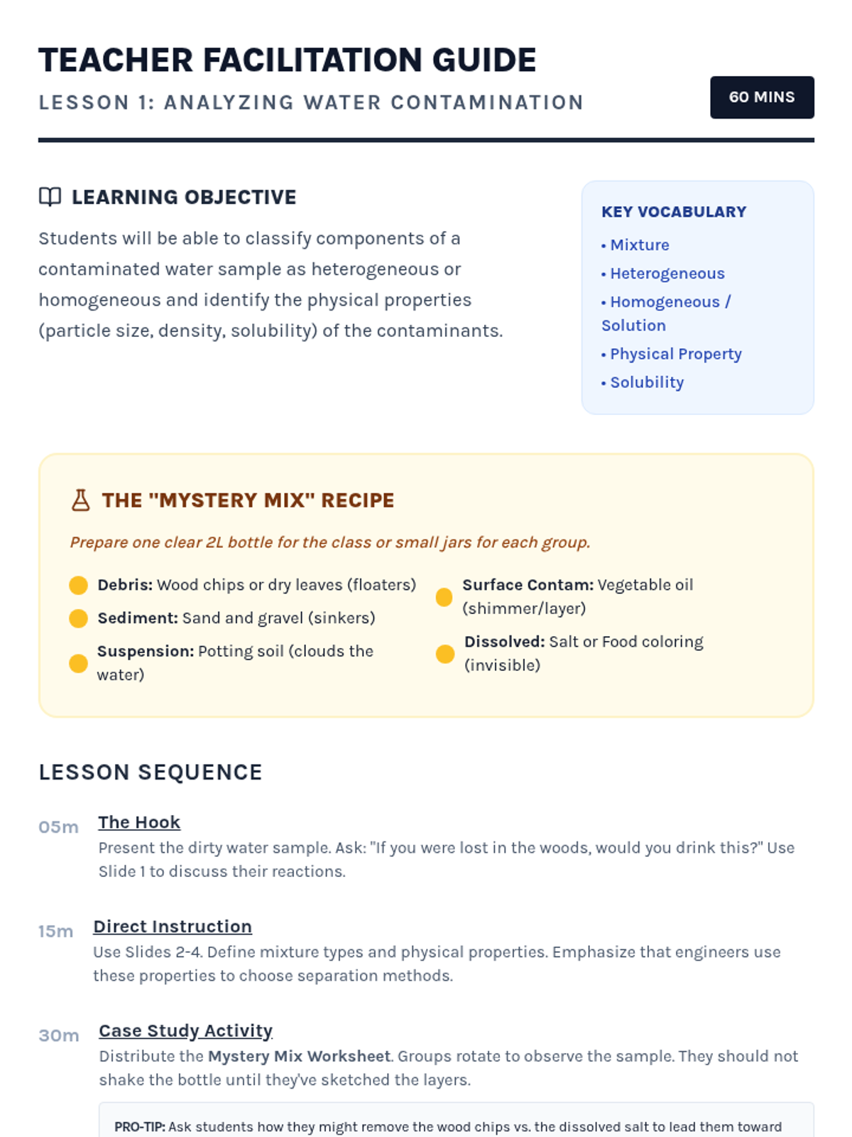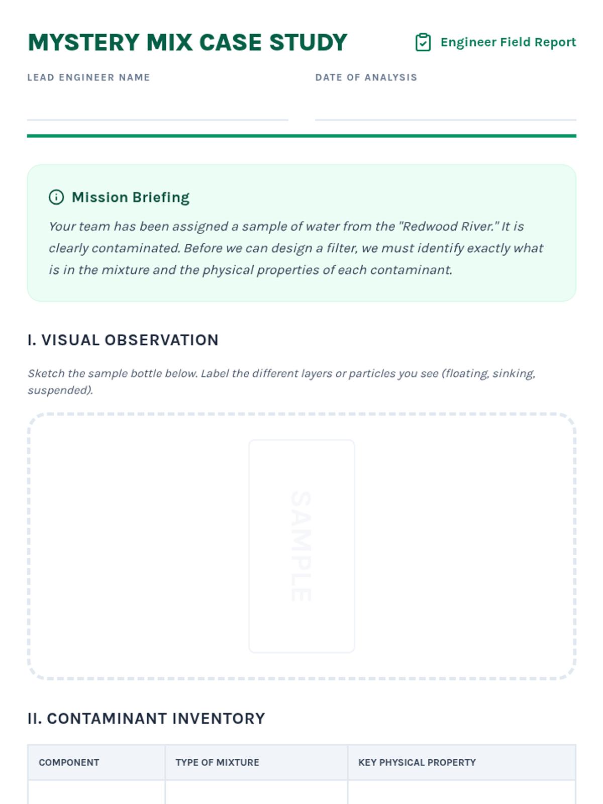 Students act as environmental engineers designing a multi-stage water filtration system. They explore sedimentation, decanting, and various filtration media to solve a real-world water contamination challenge.