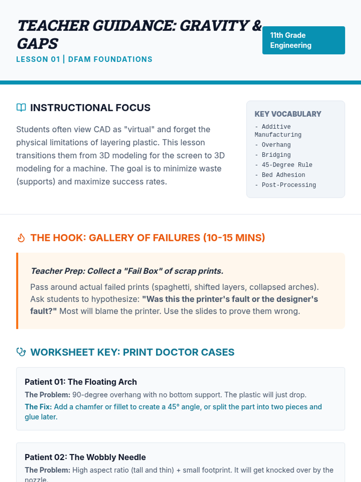 A project-oriented sequence for 11th-grade engineering students focusing on Design for Additive Manufacturing (DFAM), tolerances, slicing, and iterative CAD design. Students move from analyzing print failures to creating a fully documented, printable 3D model.