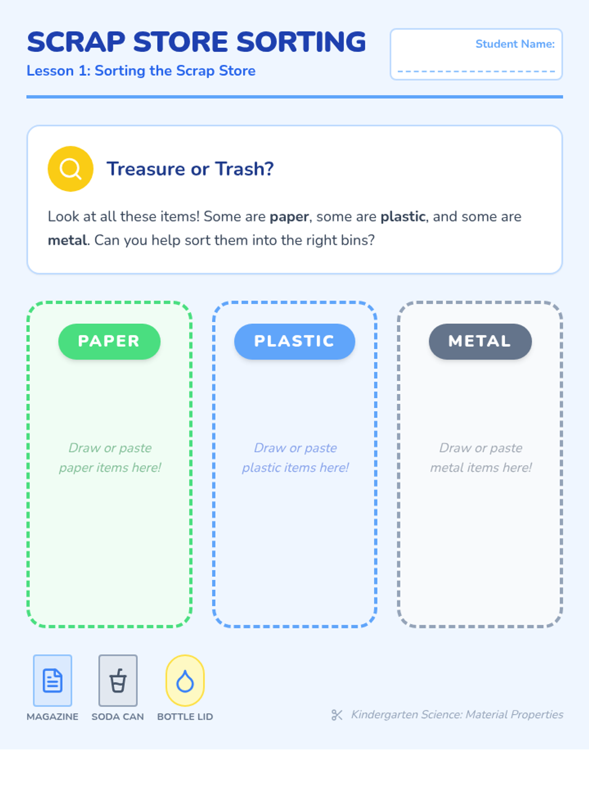 A project-based physics sequence for Kindergarten students exploring the properties of recycled materials. Students learn to sort, manipulate, and join various materials to create artistic 'Junk Modeling' masterpieces.