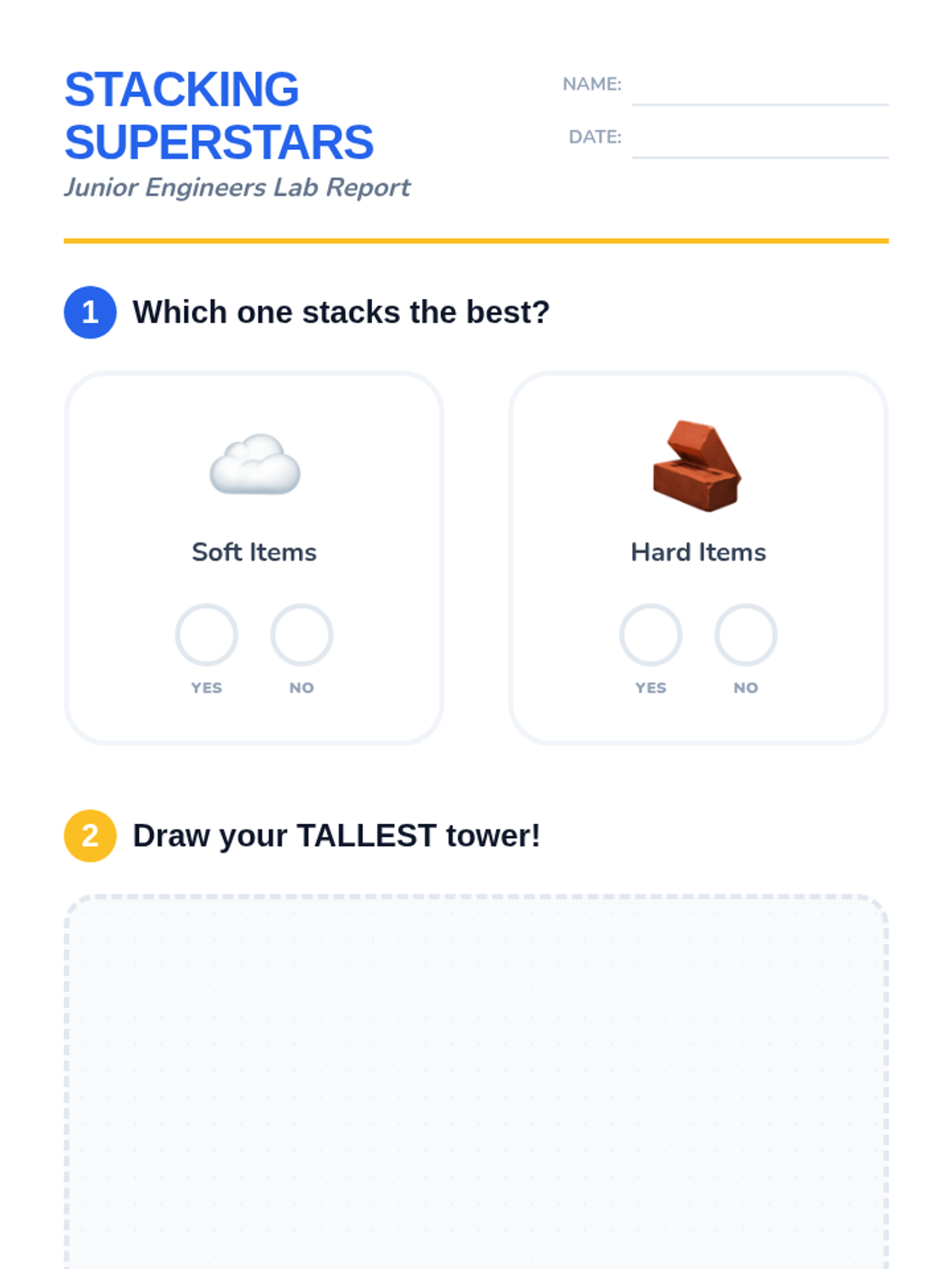A project-based physics sequence for Pre-K students exploring material properties, hardness, and structural stability through hands-on stacking and building challenges. Students act as little engineers to discover why certain materials are better for construction than others.