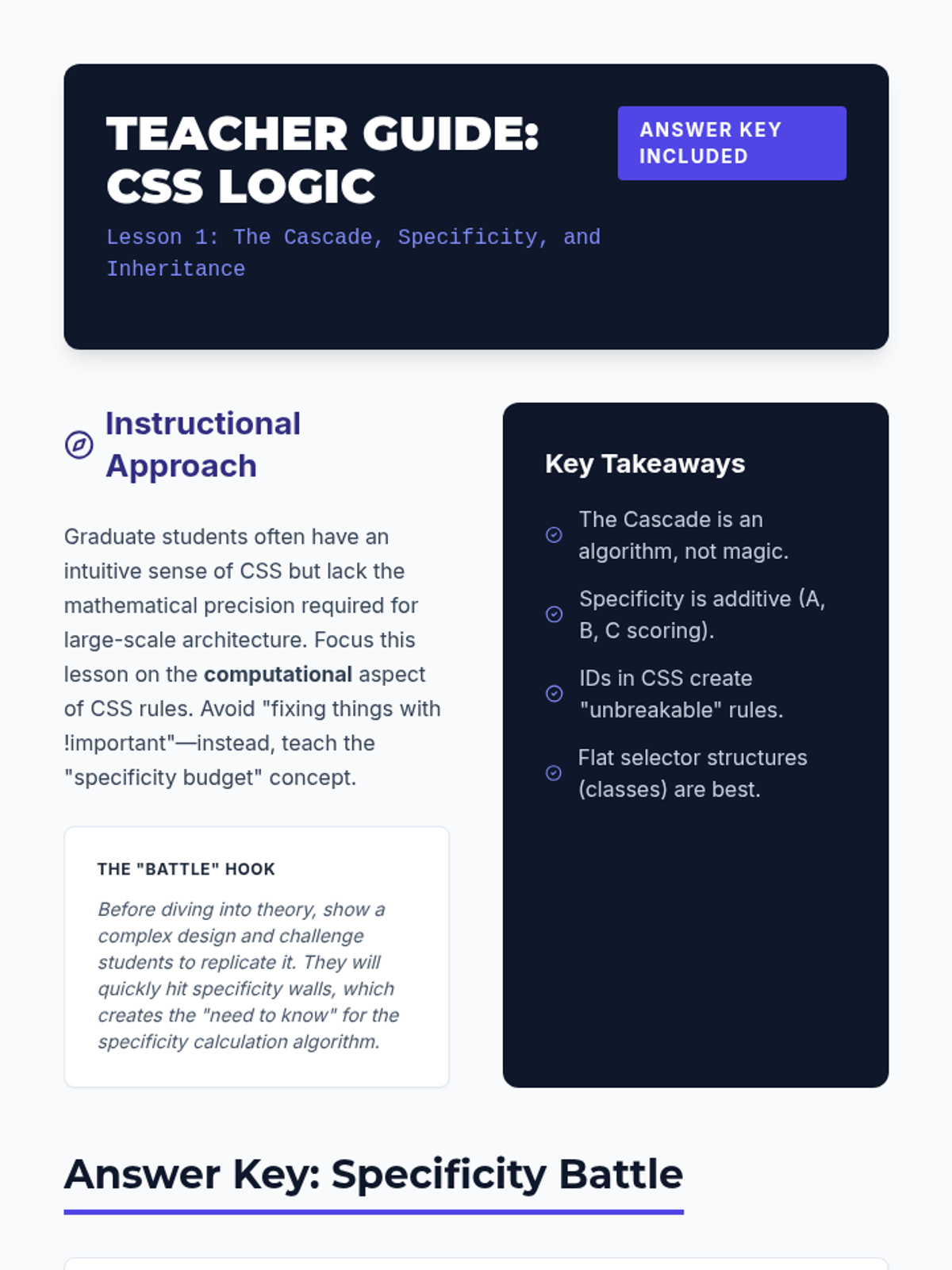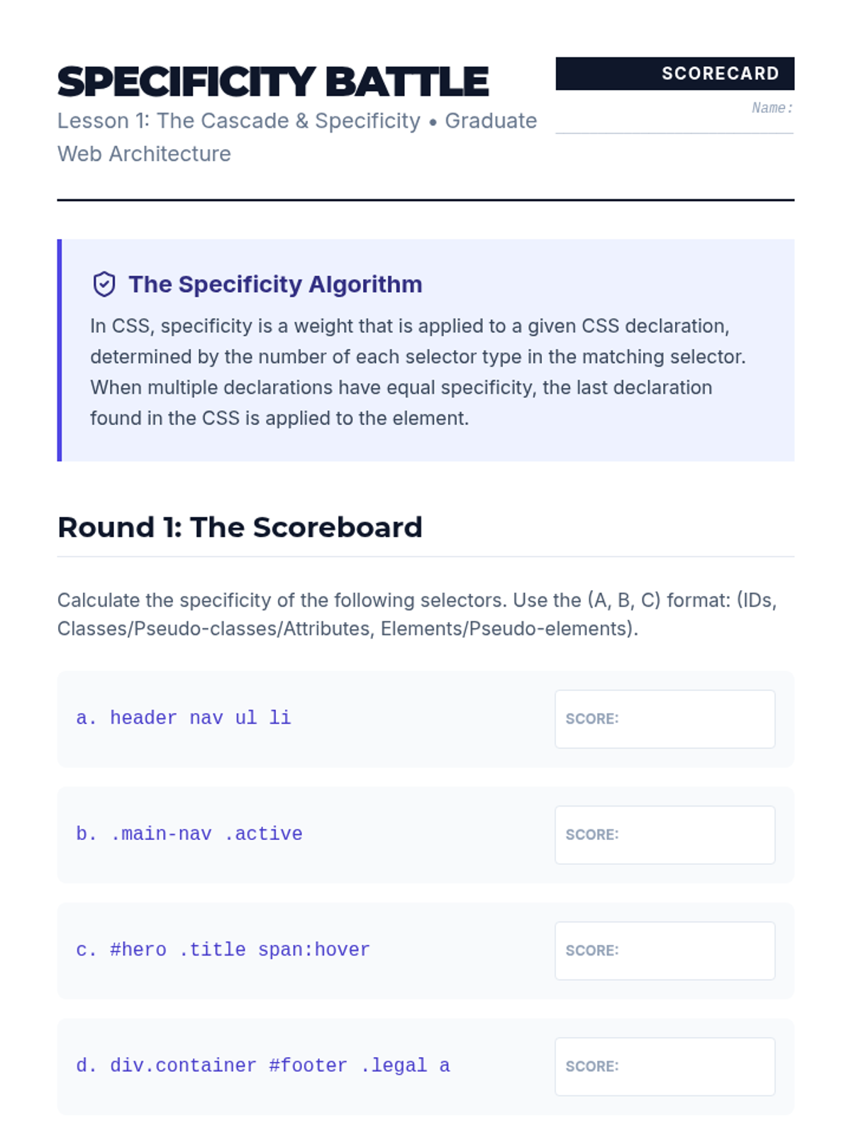 A comprehensive graduate-level sequence on professional CSS architecture, covering the cascade, Flexbox, CSS Grid, mobile-first responsiveness, and scalable design systems using BEM and variables.