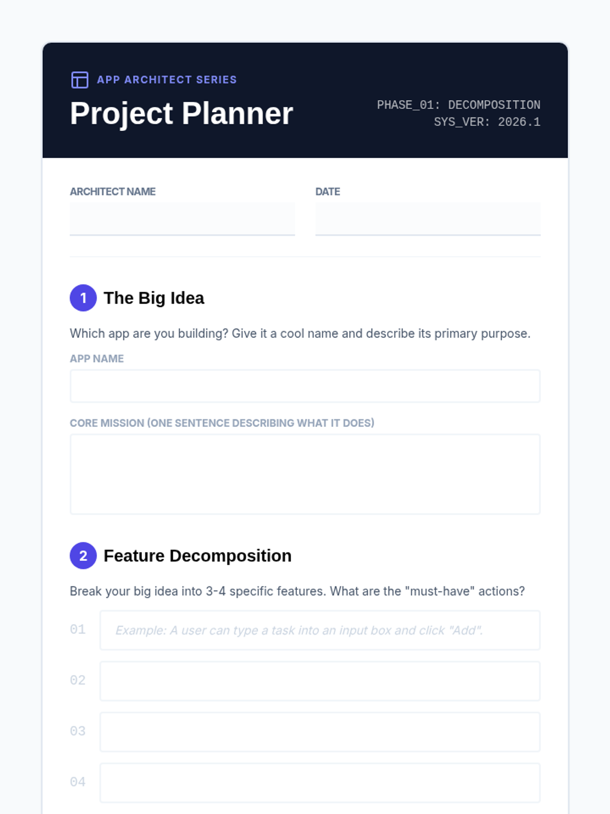 A project-based journey where students learn to build functional web applications using AI. They master decomposition, structural planning, logical implementation, and aesthetic styling to turn ideas into working digital products.