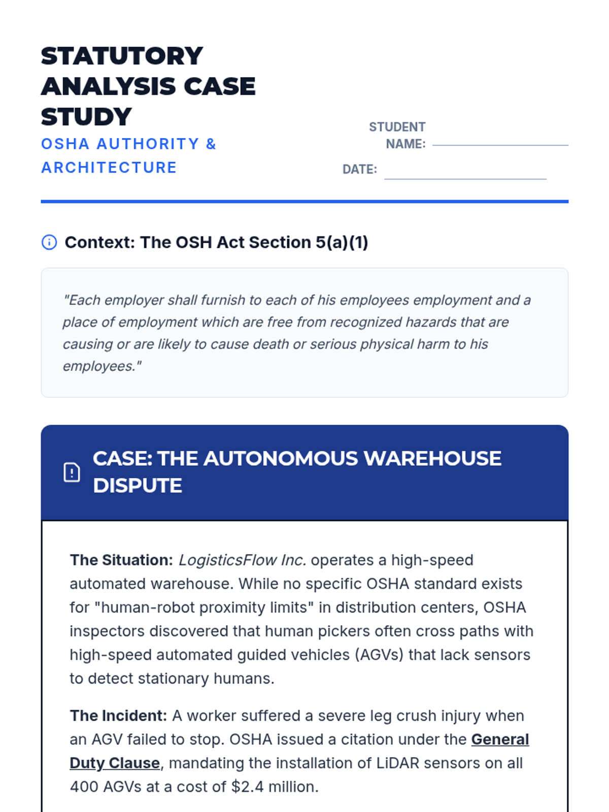 An advanced graduate-level sequence exploring the legal and regulatory framework of OSHA. Students analyze statutory authority, navigate complex CFR standards, evaluate liability through case law, and perform mock compliance audits to prepare for strategic safety leadership.