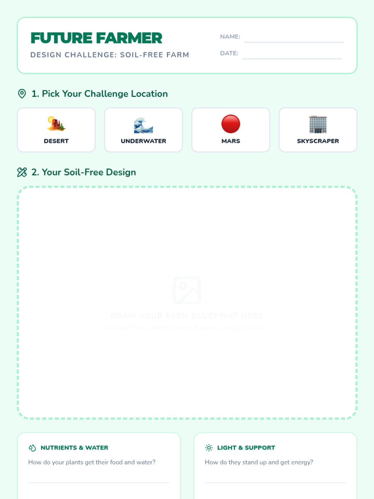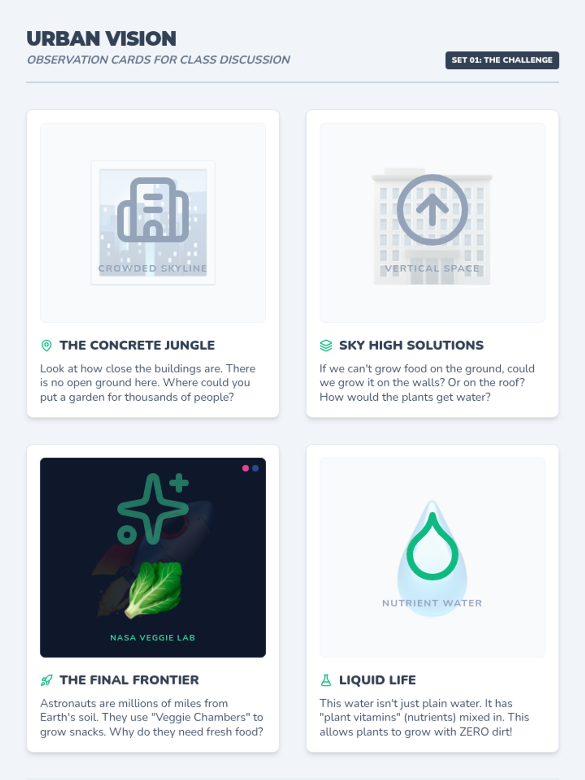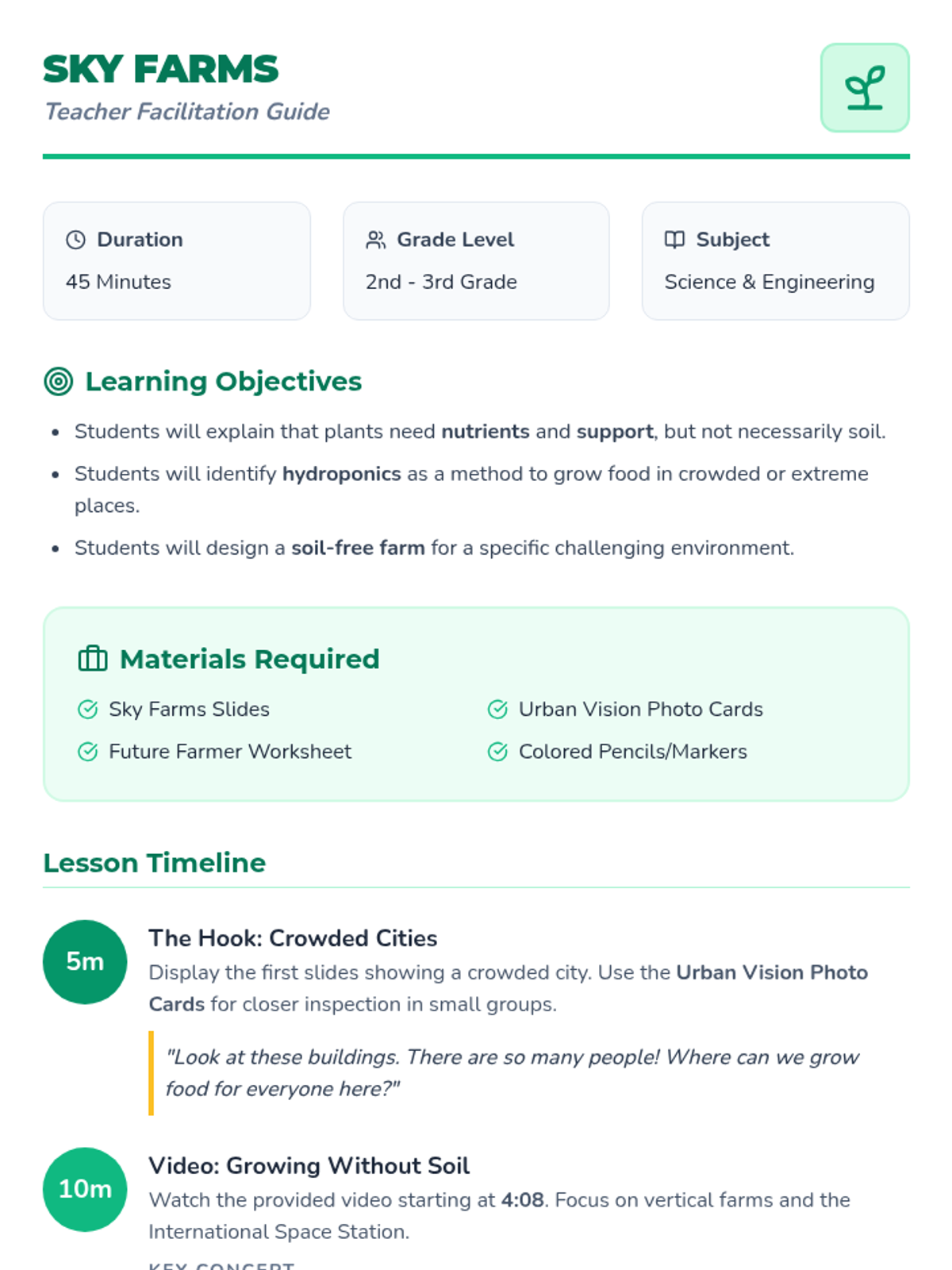 A short sequence for lower elementary students exploring how humans adapt farming techniques to grow food in challenging environments like crowded cities and outer space without using soil.
