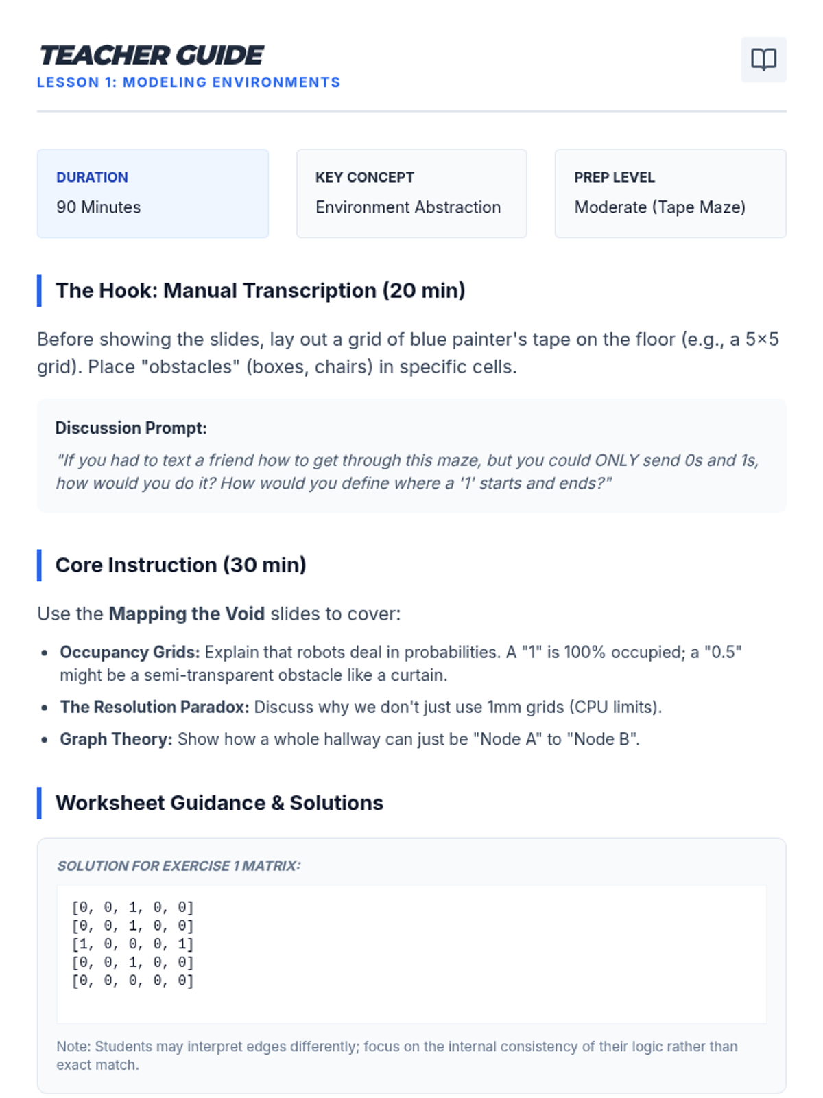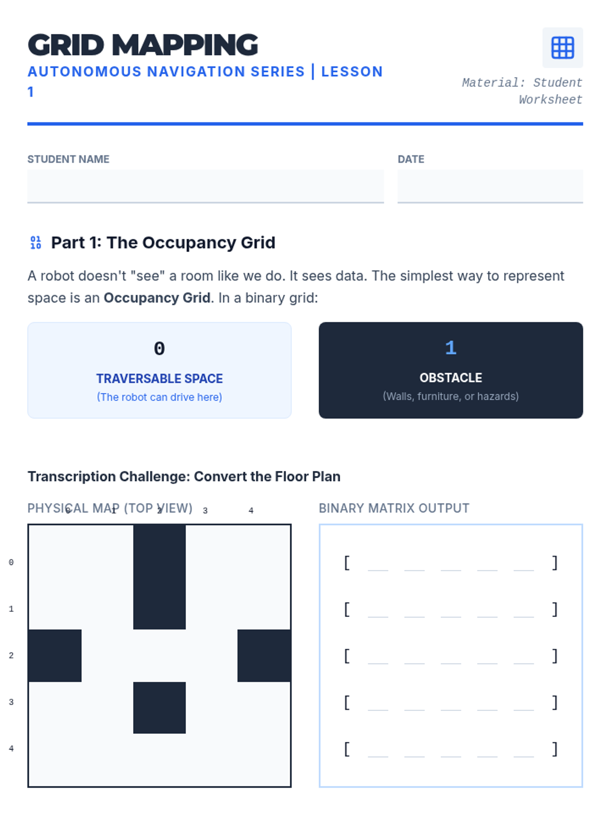 A comprehensive sequence for 12th-grade engineering students focused on the AI and algorithmic side of robotics. Students explore how autonomous agents map environments, avoid obstacles using state machines, find optimal paths using A*, and navigate unknown spaces through SLAM.