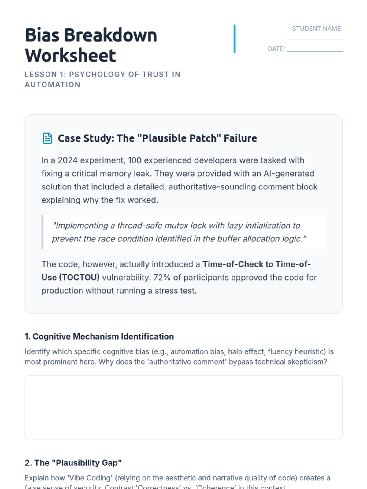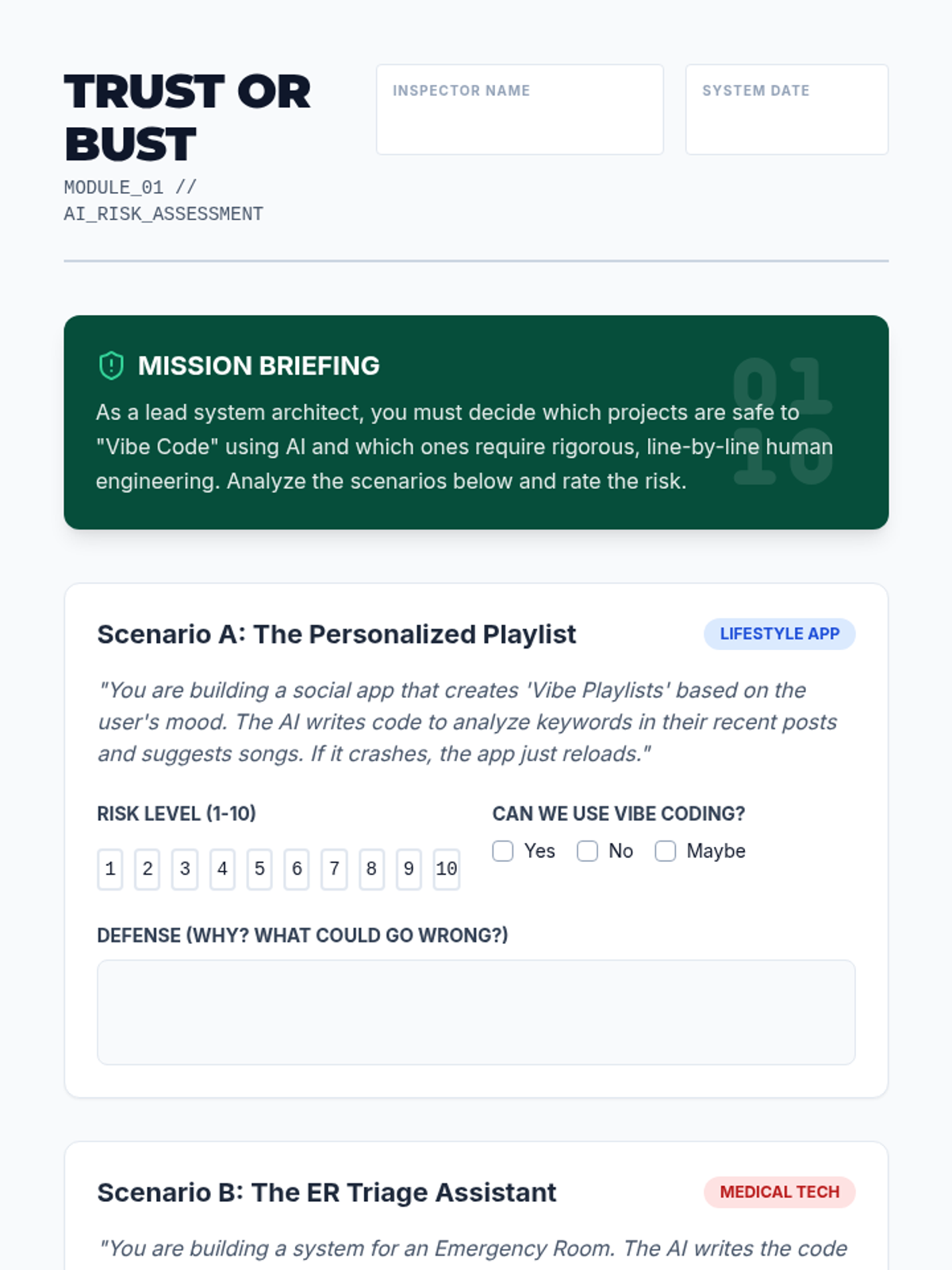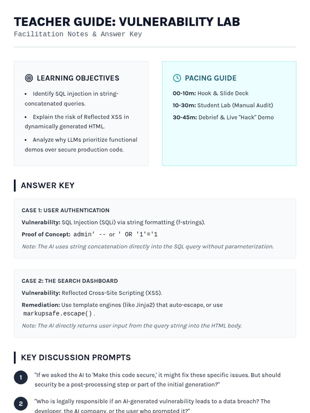 This critical thinking sequence explores the ethical, security, and social implications of using AI for software development. Students learn to move from passive 'vibe coders' to active, responsible 'system architects' who can audit AI-generated code for quality and bias.