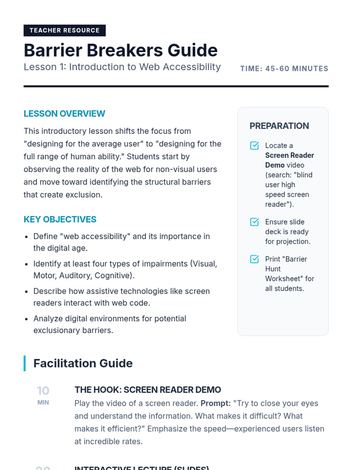 This sequence introduces undergraduate students to the critical role of keyboard navigation in assistive technology, specifically focusing on screen reader interaction. Students will analyze semantic navigation, table traversal, and focus traps to understand how to design and audit for digital accessibility.