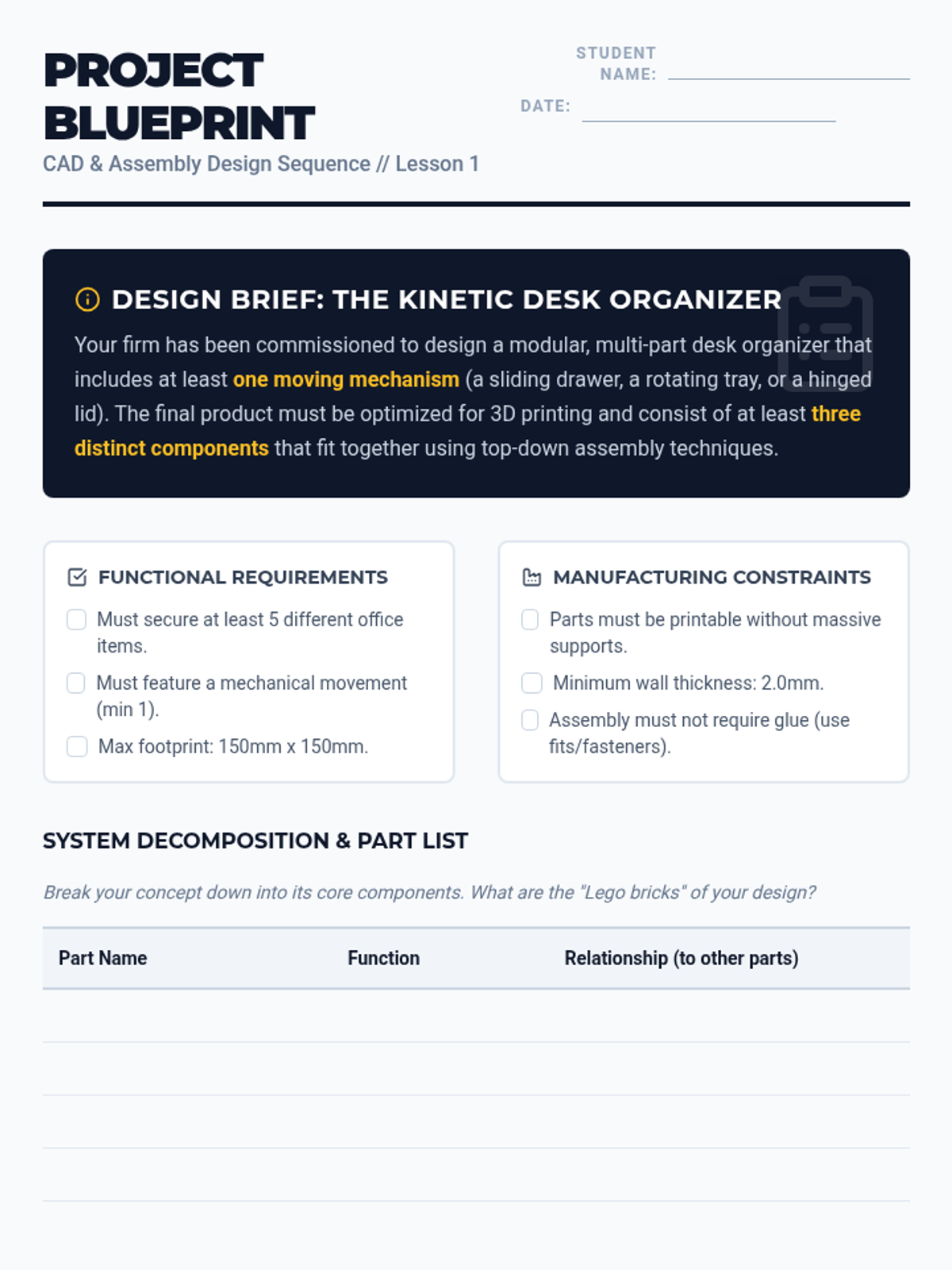A comprehensive sequence for 10th-grade students covering the full product development lifecycle in CAD, from initial concept and top-down assembly modeling to tolerance analysis, design for manufacturing (DFM), and final photorealistic rendering.