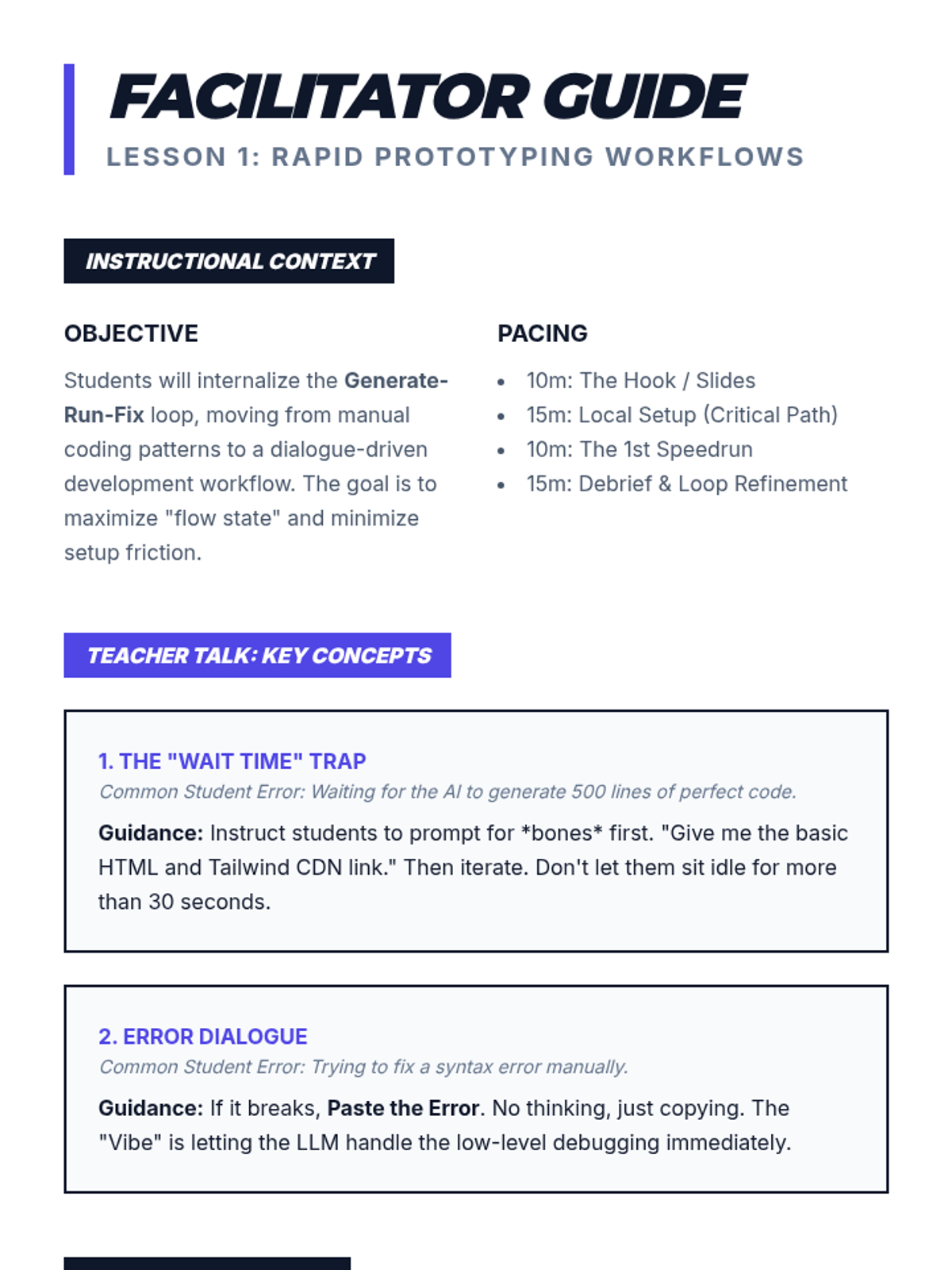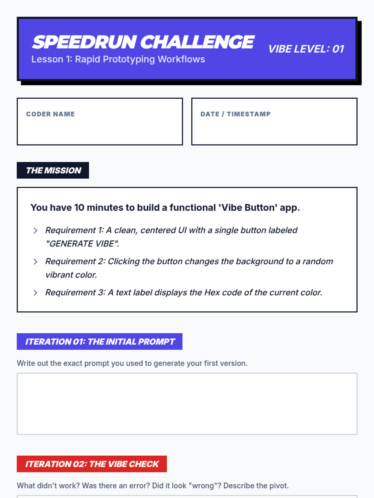 This sequence explores the 'Vibe Coding' methodology—a rapid, AI-assisted development cycle focusing on iterative prompting, descriptive debugging, and visual-driven design. Students move from basic 'speed runs' to building functional MVPs by leveraging natural language and rapid feedback loops.