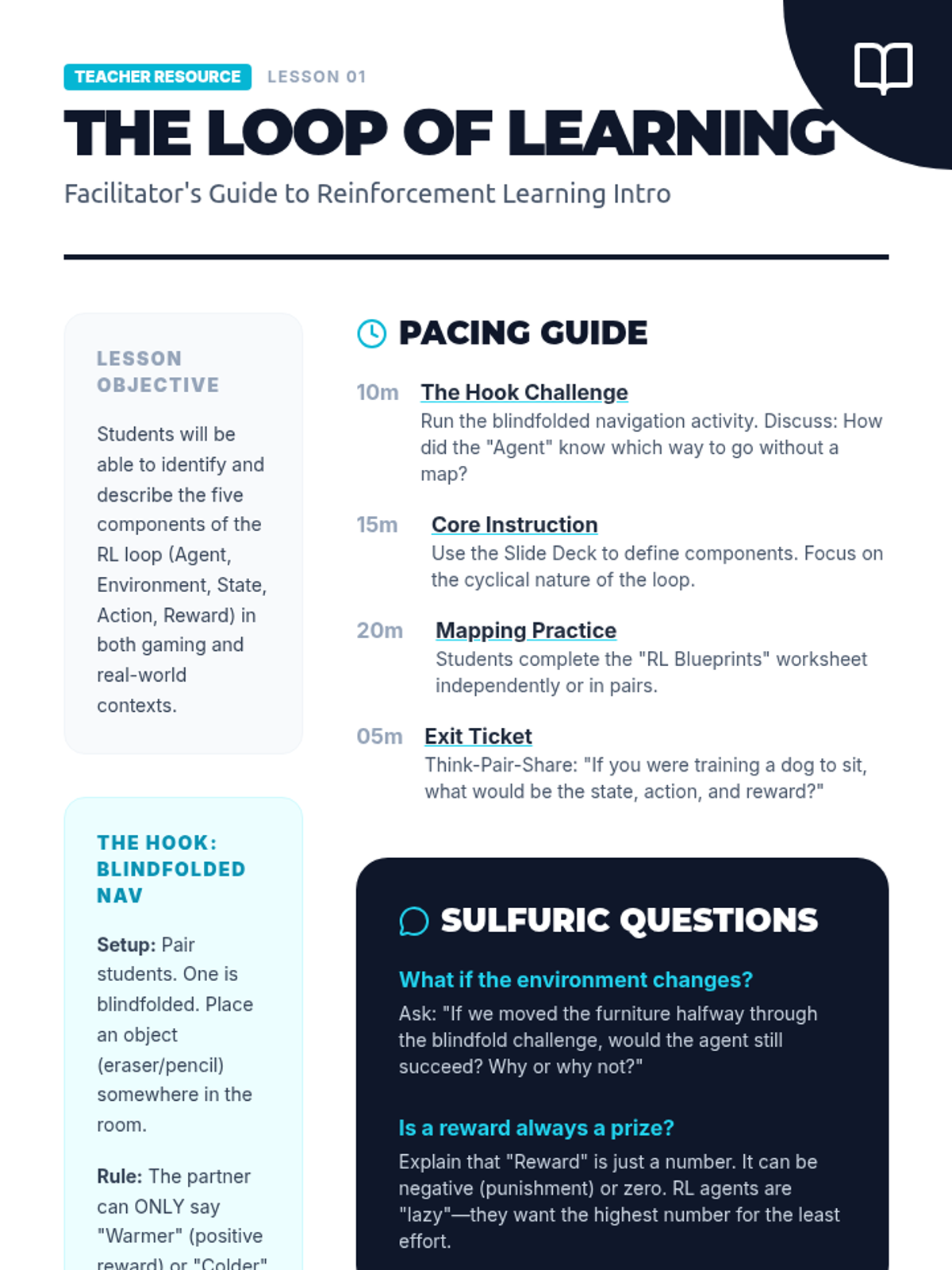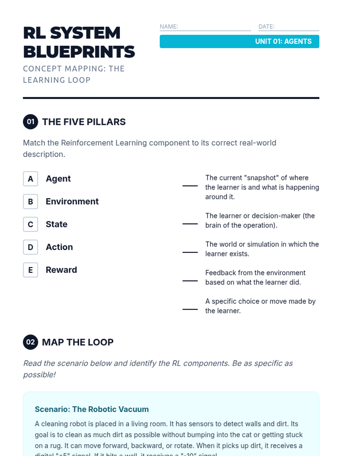 A 5-lesson sequence on Reinforcement Learning (RL), covering the agent-environment loop, reward function design, the exploration-exploitation trade-off, and real-world autonomous system applications. Students explore how AI learns through trial and error to solve complex tasks.