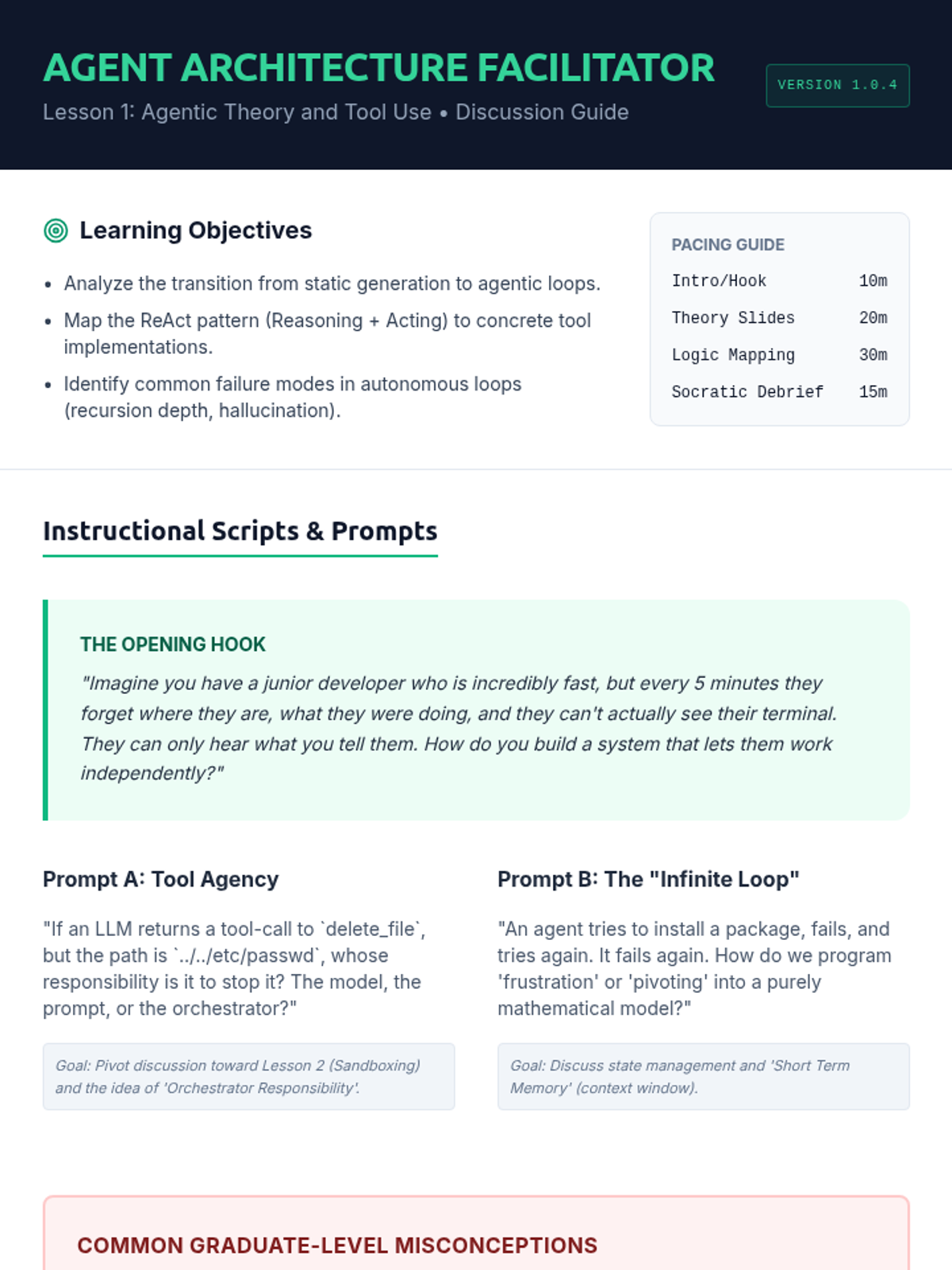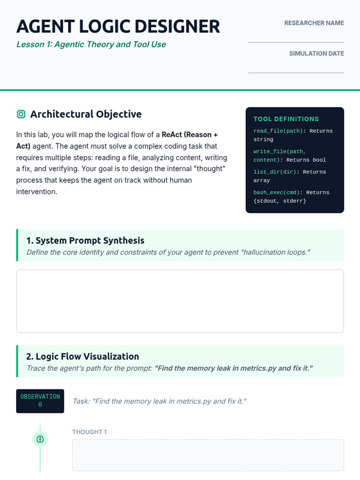 An advanced engineering sequence for graduate students exploring the architecture, security, and implementation of autonomous AI coding agents. Students progress from tool-use theory to building self-healing, multi-agent systems.
