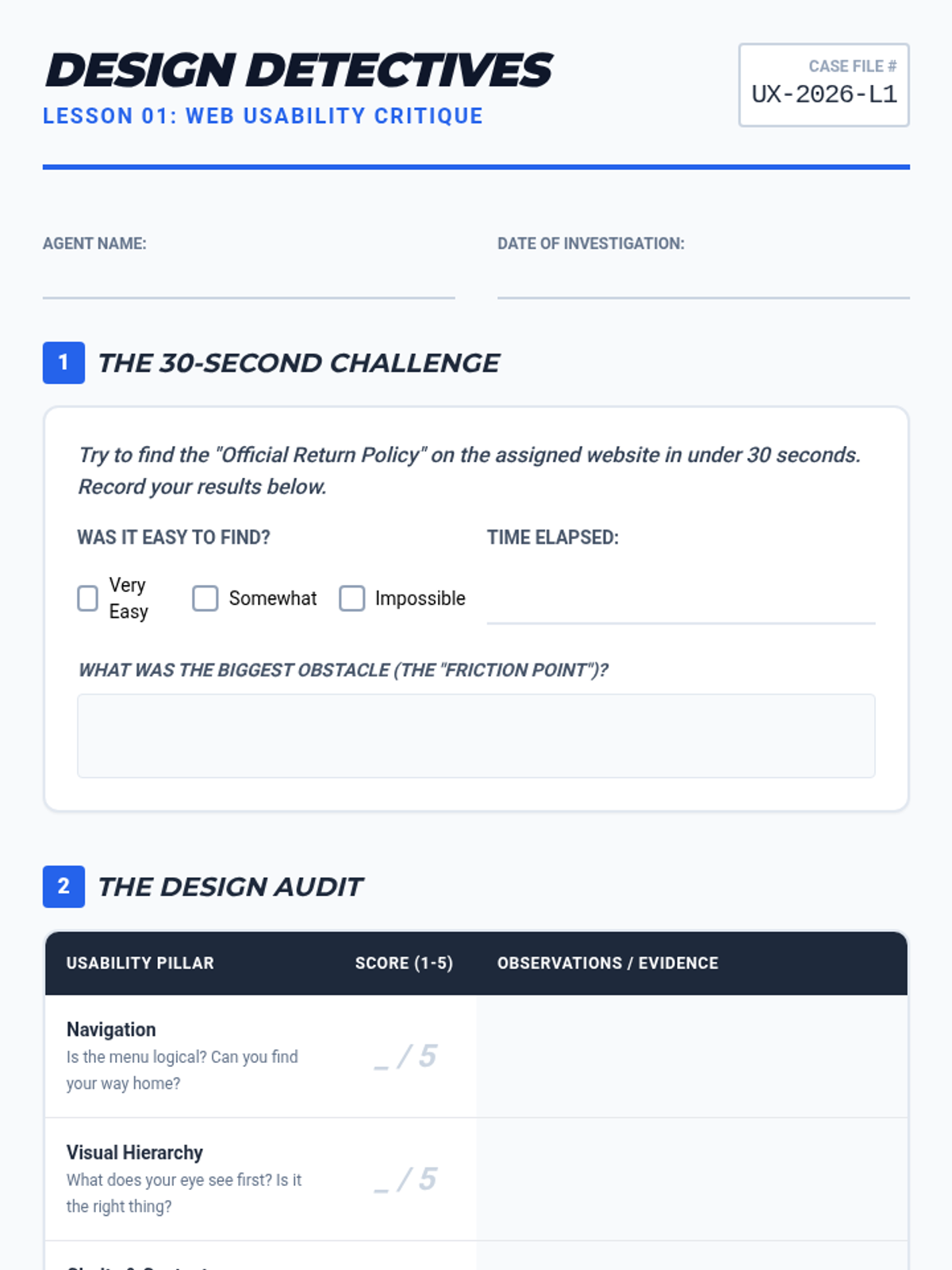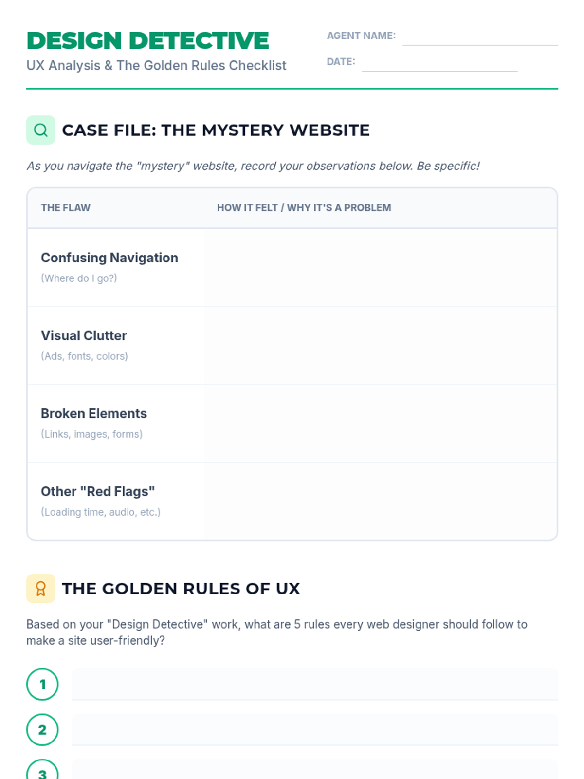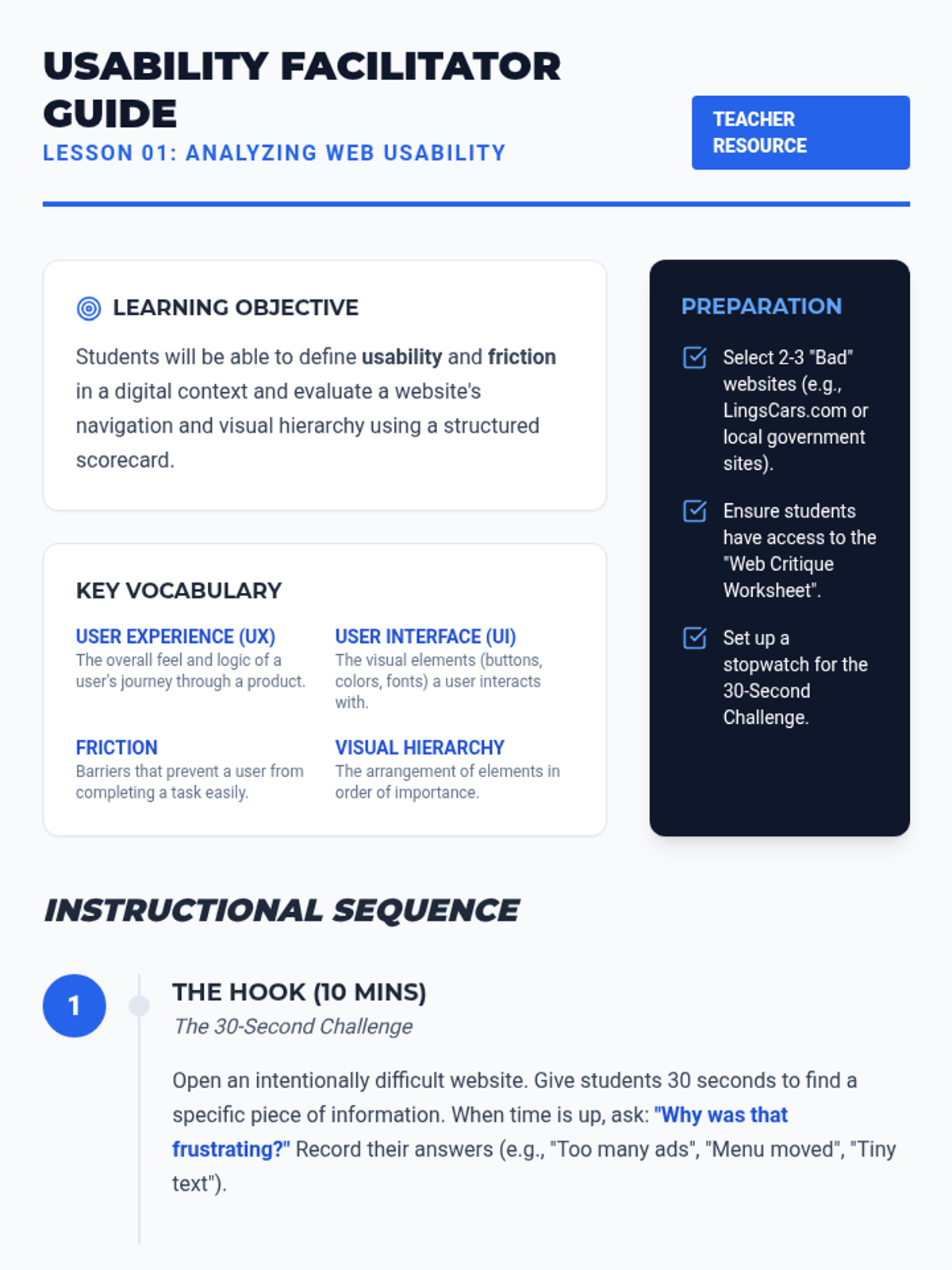 This sequence shifts focus from writing code to designing for human needs through User Experience (UX) and User Interface (UI) principles. Students adopt the role of UX researchers, analyzing existing sites for usability and accessibility failures before they write a single line of code.