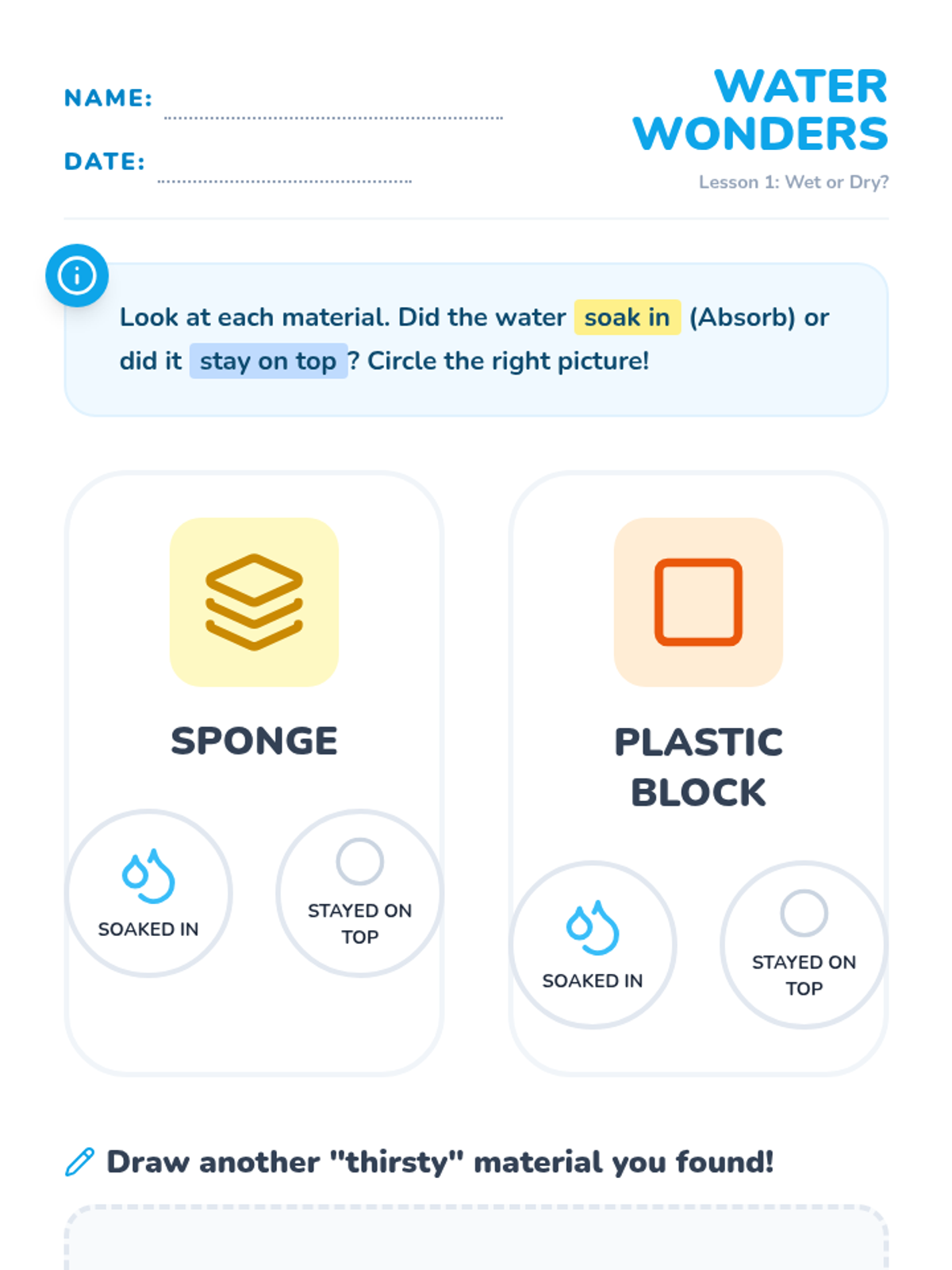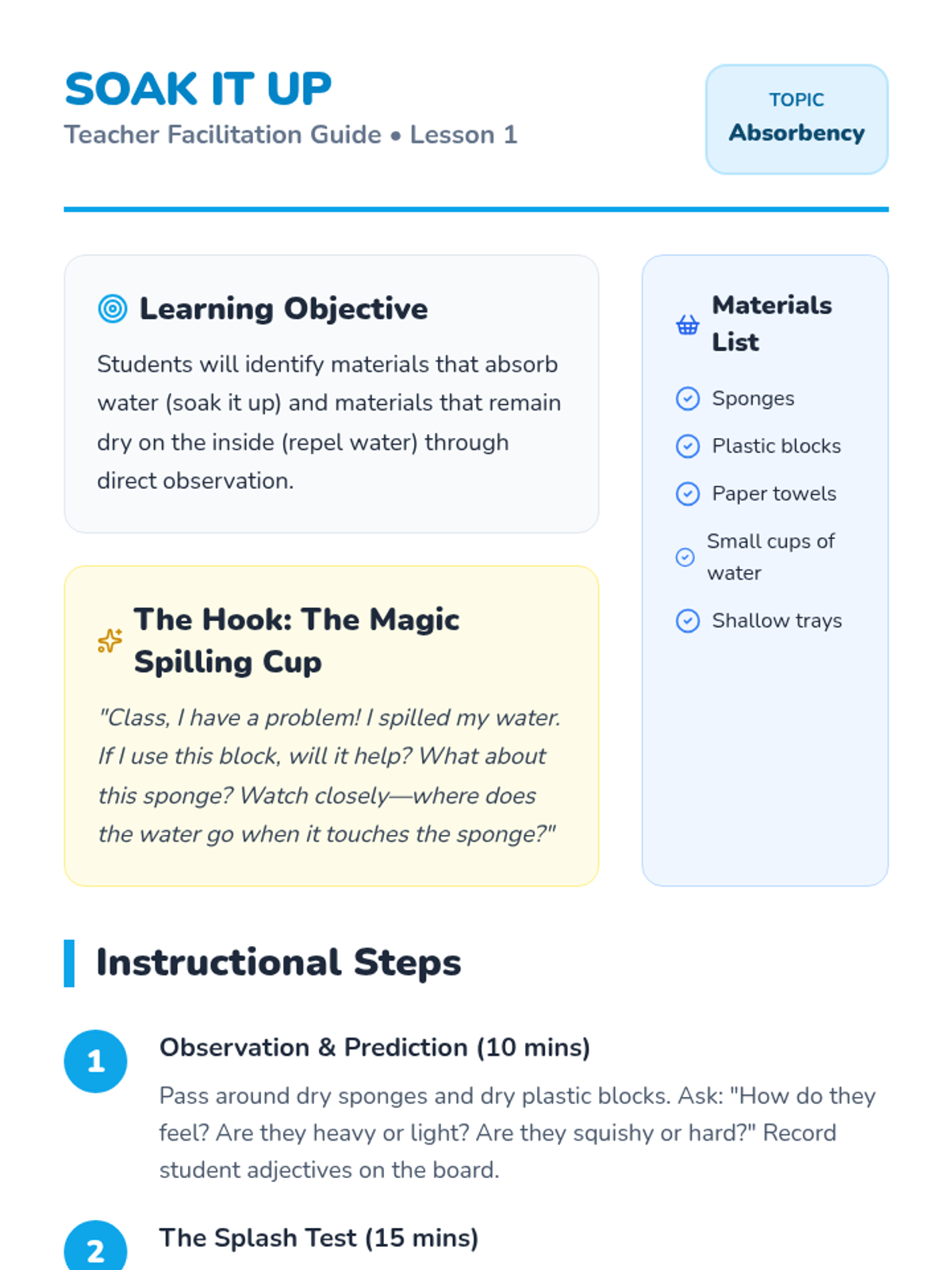 This kindergarten physics sequence explores how different materials interact with water. Students investigate absorbency and water resistance through hands-on experiments, leading to an engineering challenge where they design a waterproof boat.