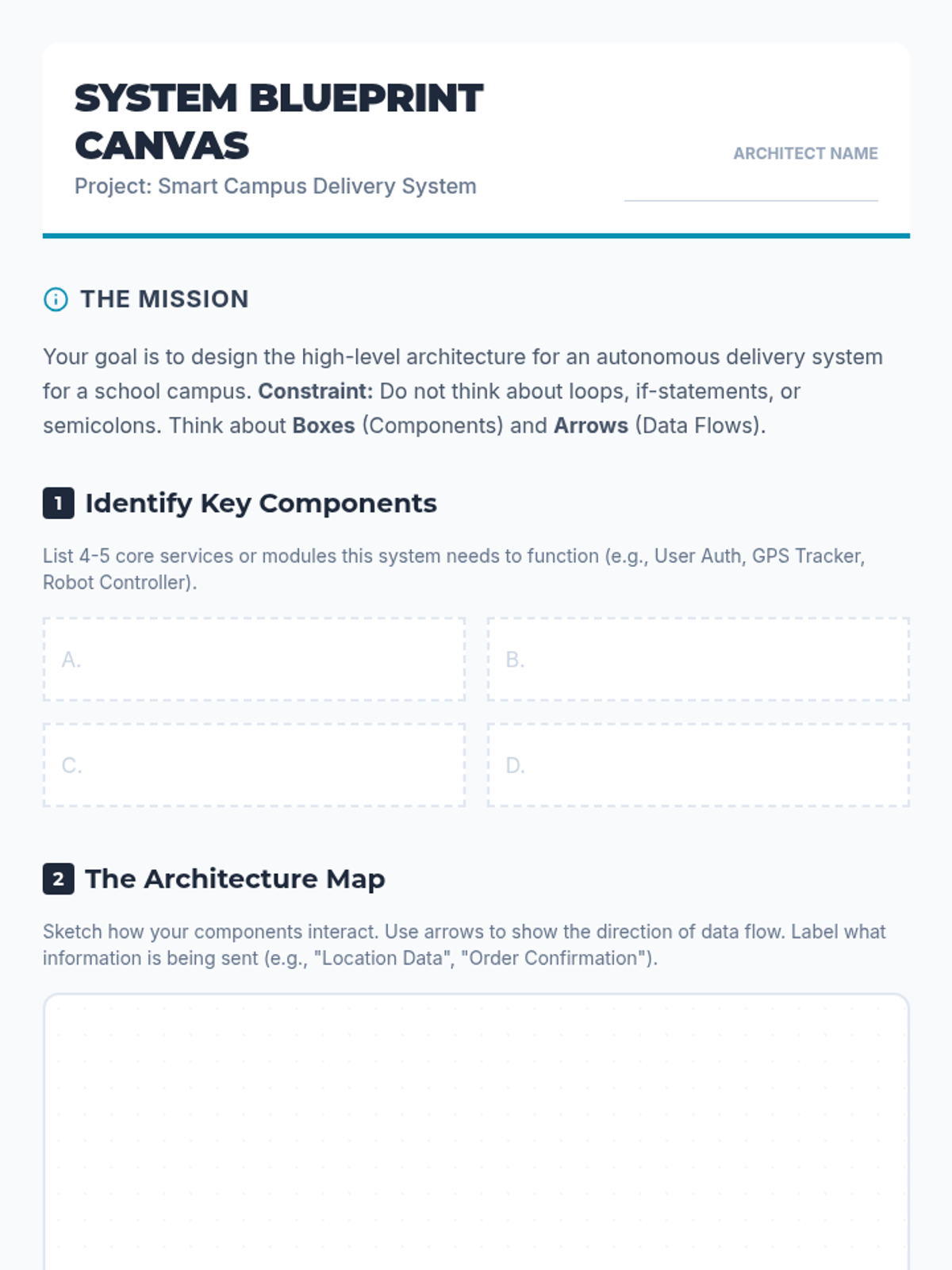 A high-level systems architecture course for 12th graders where the focus shifts from writing syntax to designing data flows, API contracts, and multi-agent workflows using AI. Students learn to act as architects rather than just coders.