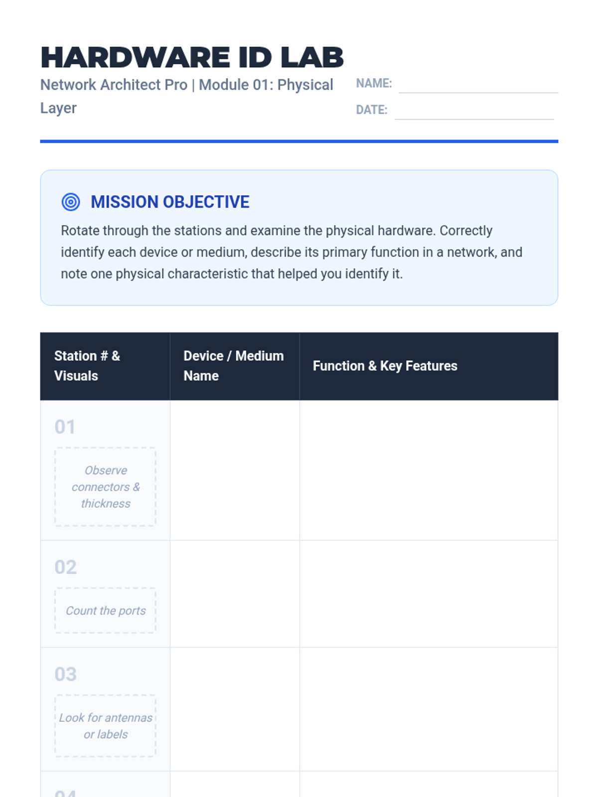 This sequence introduces students to the physical and logical structures of computer networks, covering hardware, transmission media, and topologies. Students progress from identifying basic components to diagramming complex home networks.