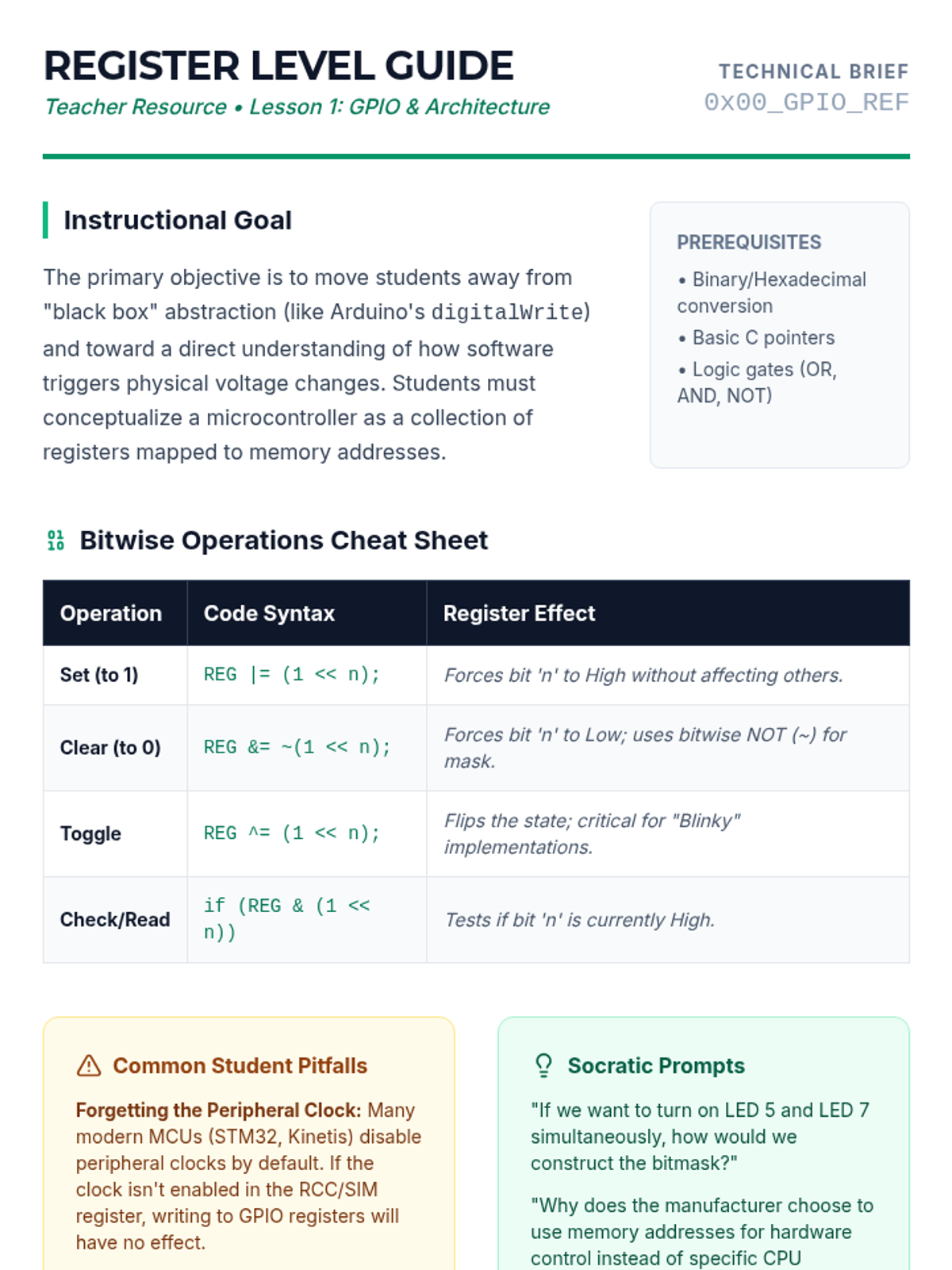 A project-based sequence for undergraduate computer science students focusing on interfacing microcontrollers with physical peripherals. Students progress from basic GPIO and bitwise manipulation to complex interrupt-driven systems, PWM, and serial protocols, culminating in real-time system design.