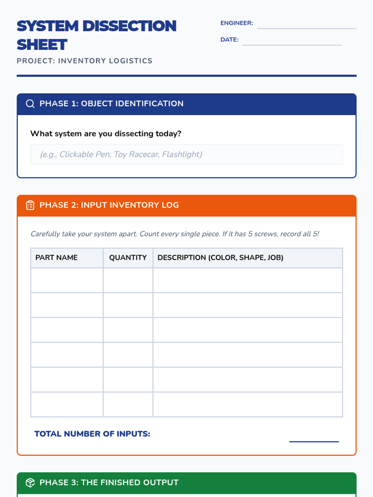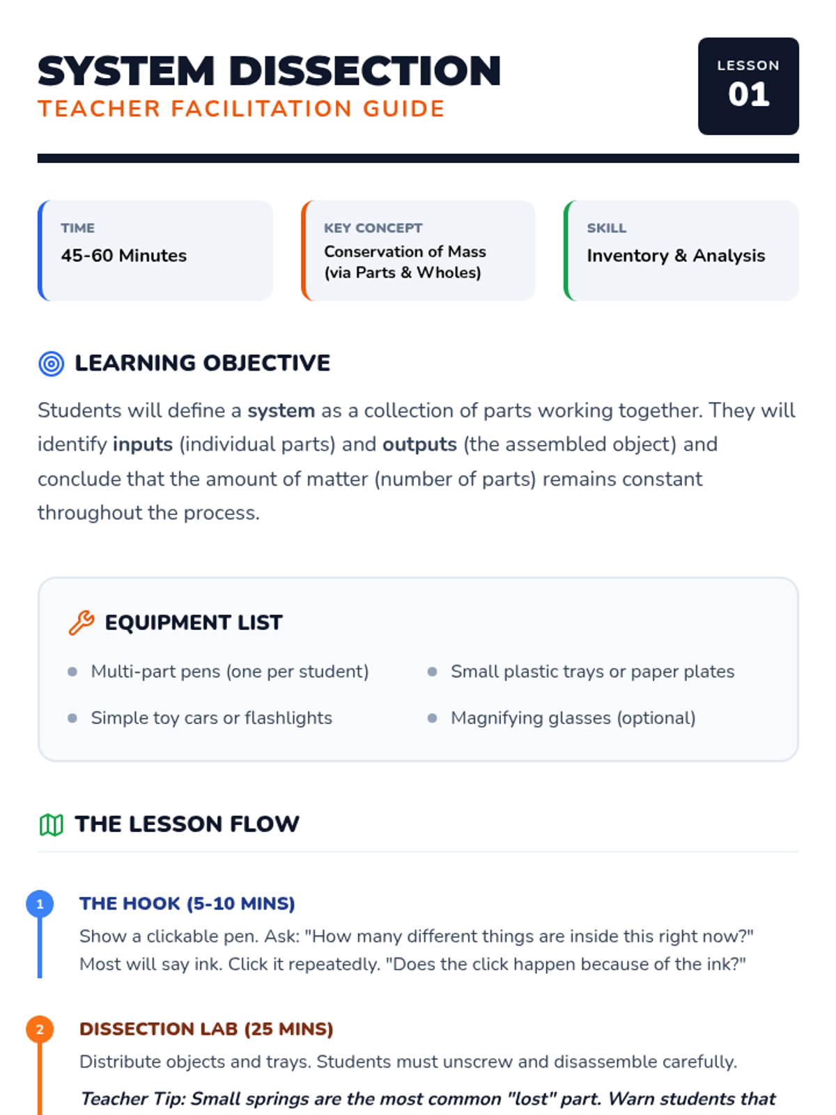 A 3rd-grade introductory chemistry sequence that uses mechanical systems (toy cars, pens) to teach the conservation of matter. Students explore 'inputs' and 'outputs' through disassembly, diagramming, and factory simulations to understand that matter is rearranged, not created or destroyed.