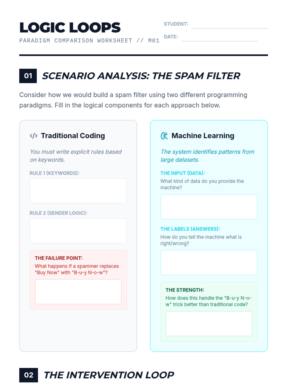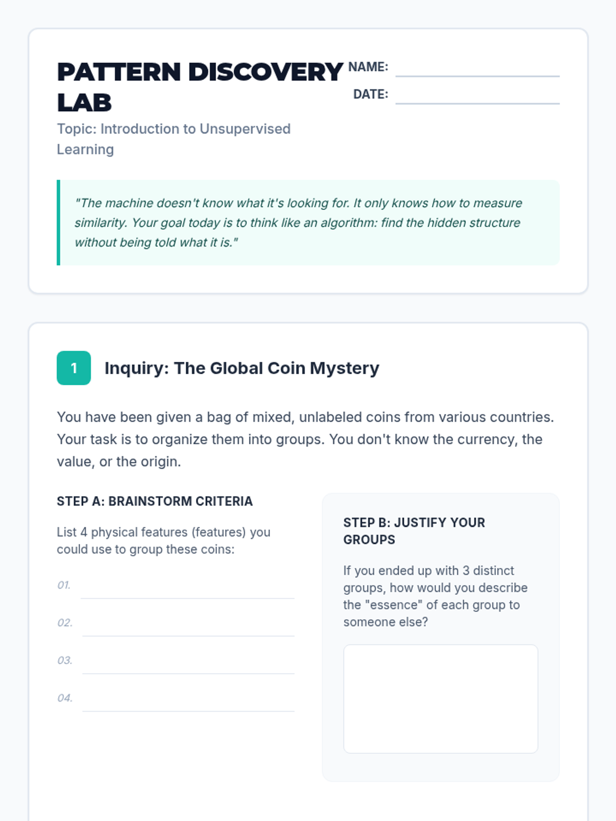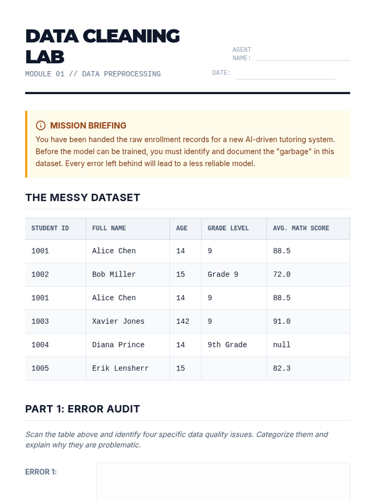 This sequence introduces students to the foundational concepts of machine learning, distinguishing it from traditional programming through the lens of data quality and ethics. Students progress through algorithmic bias analysis, data types, cleaning techniques, and the critical split between training and testing data.
