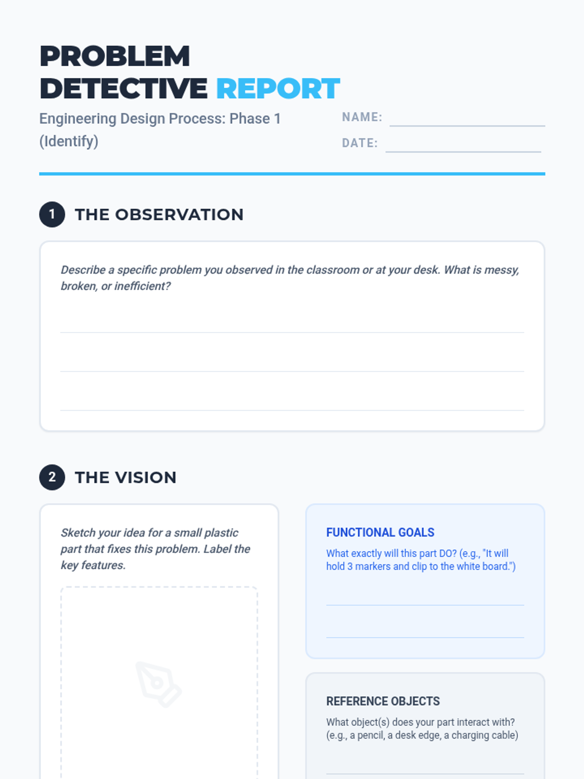 Students apply the engineering design process to solve real-world problems using CAD tools, focusing on accuracy, functional constraints, and iterative design. They move from identifying user needs to measuring objects with calipers and translating measurements into digital prototypes for manufacturing.