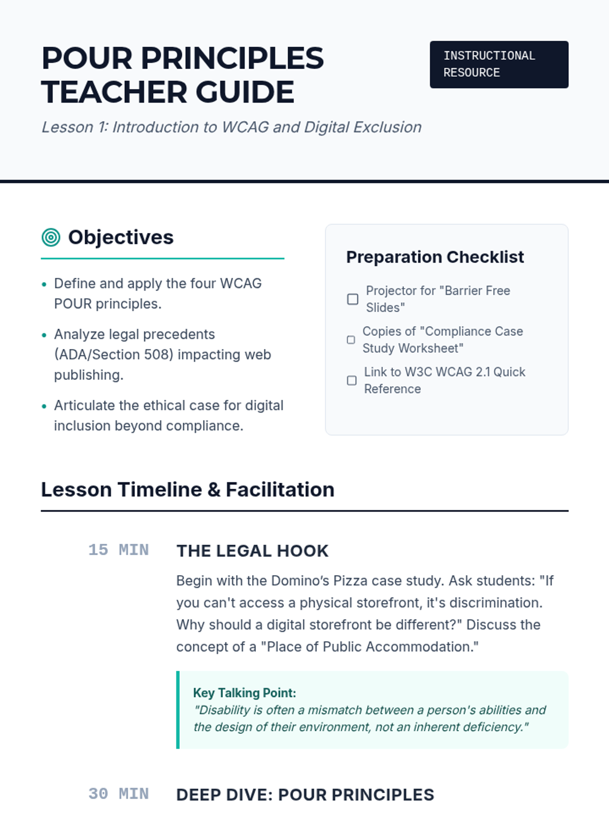 A comprehensive sequence for 10th Grade students exploring the ethical and technical standards of Web Accessibility (a11y), focusing on WCAG guidelines, inclusive design, and technical remediation for visual, motor, and cognitive disabilities.