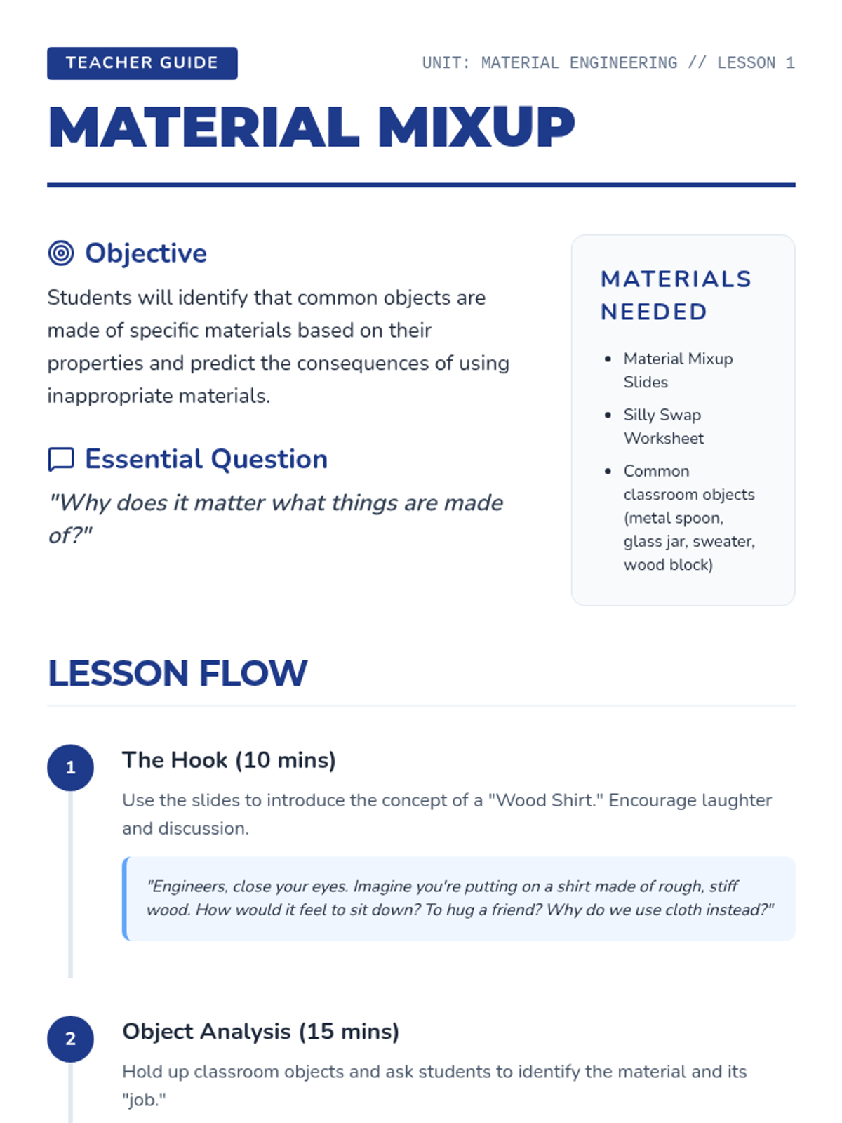 Students adopt the role of junior engineers to evaluate materials for specific purposes. They analyze everyday objects, test for water resistance and strength, and finally design and build a protective shelter for a toy animal.