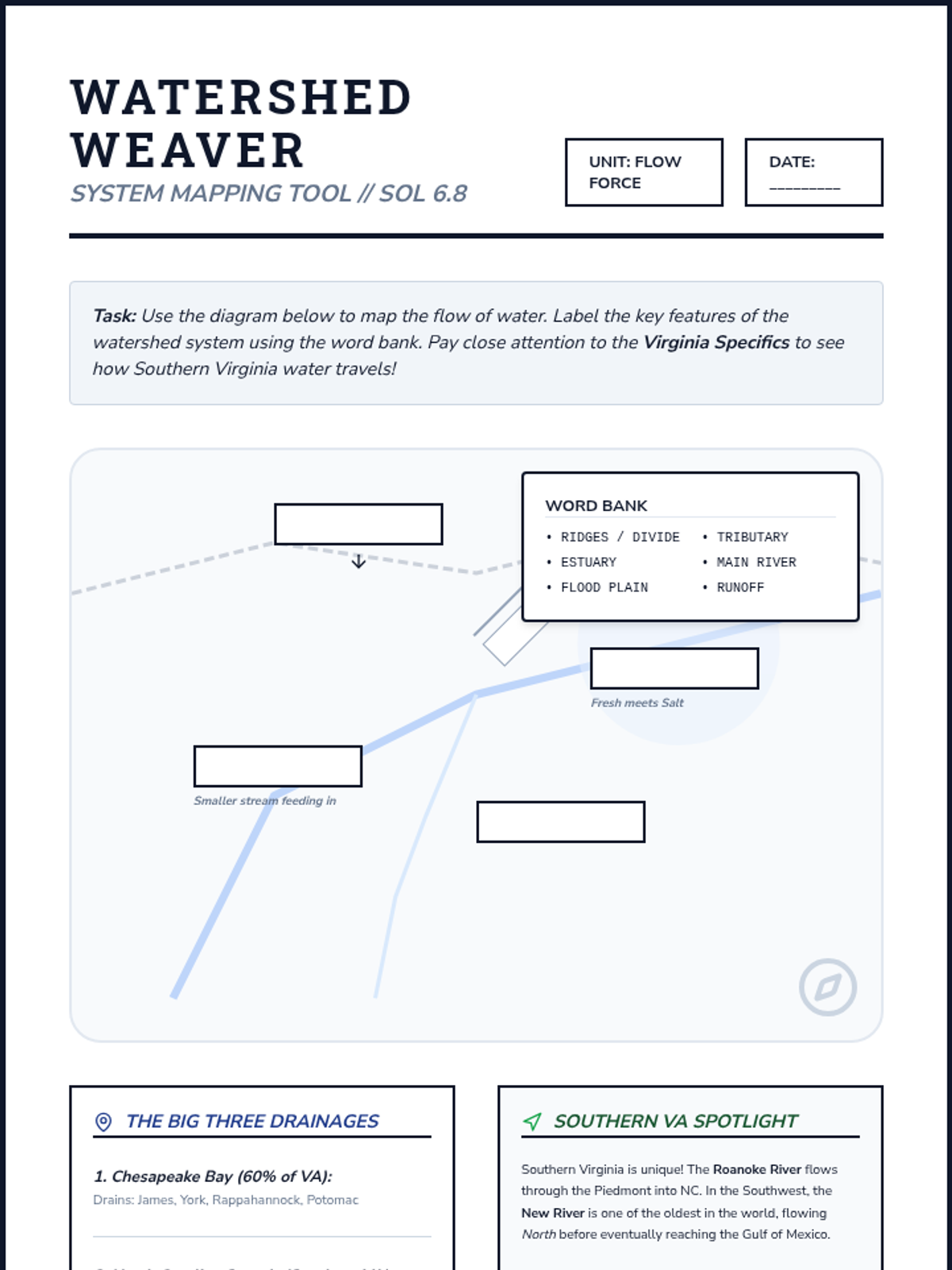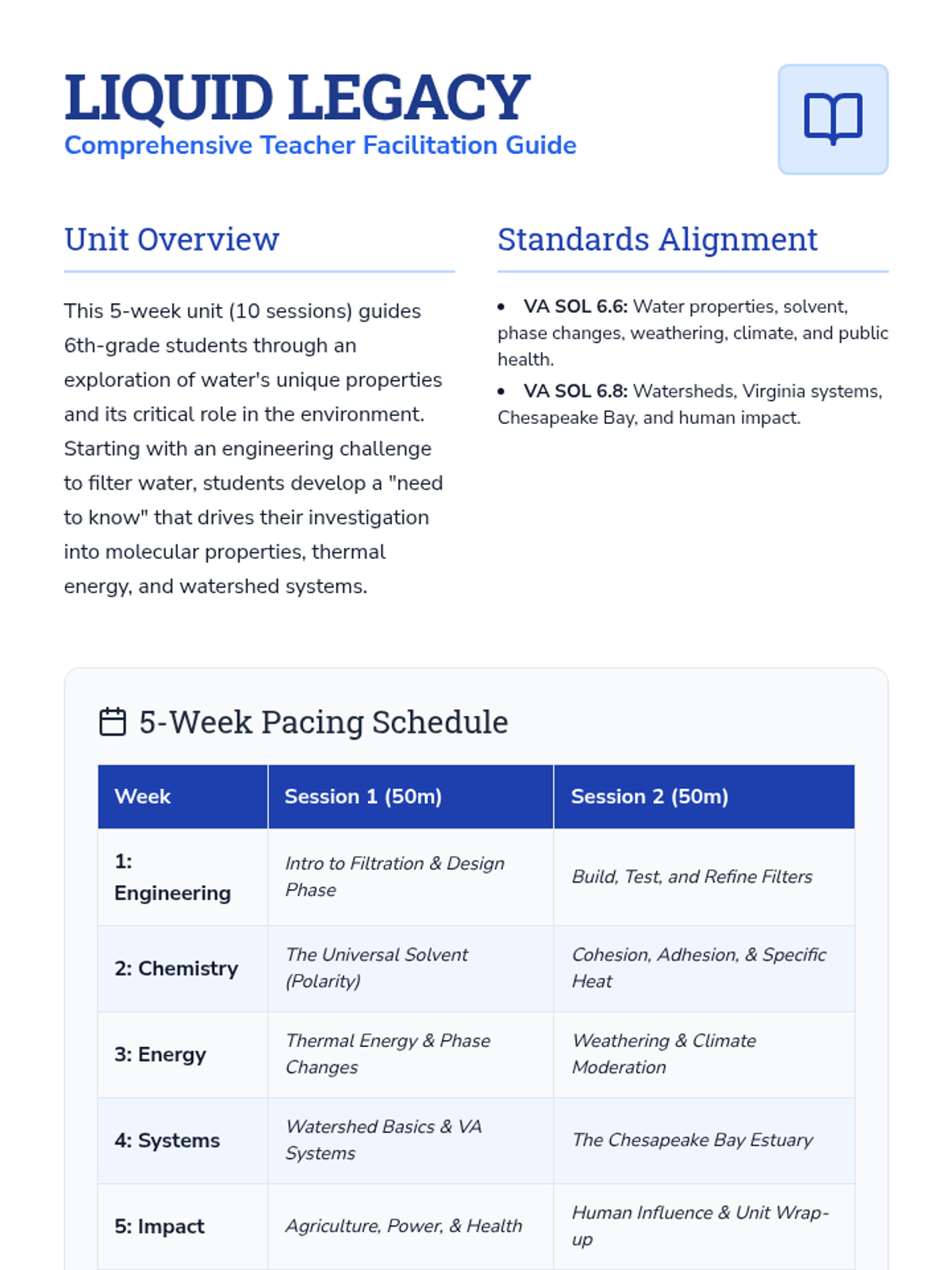 A comprehensive 5-week sequence exploring the physical properties of water, the engineering of water filtration, and the complex systems of Virginia's watersheds. Students move from hands-on engineering to chemical properties and finally to large-scale environmental systems.