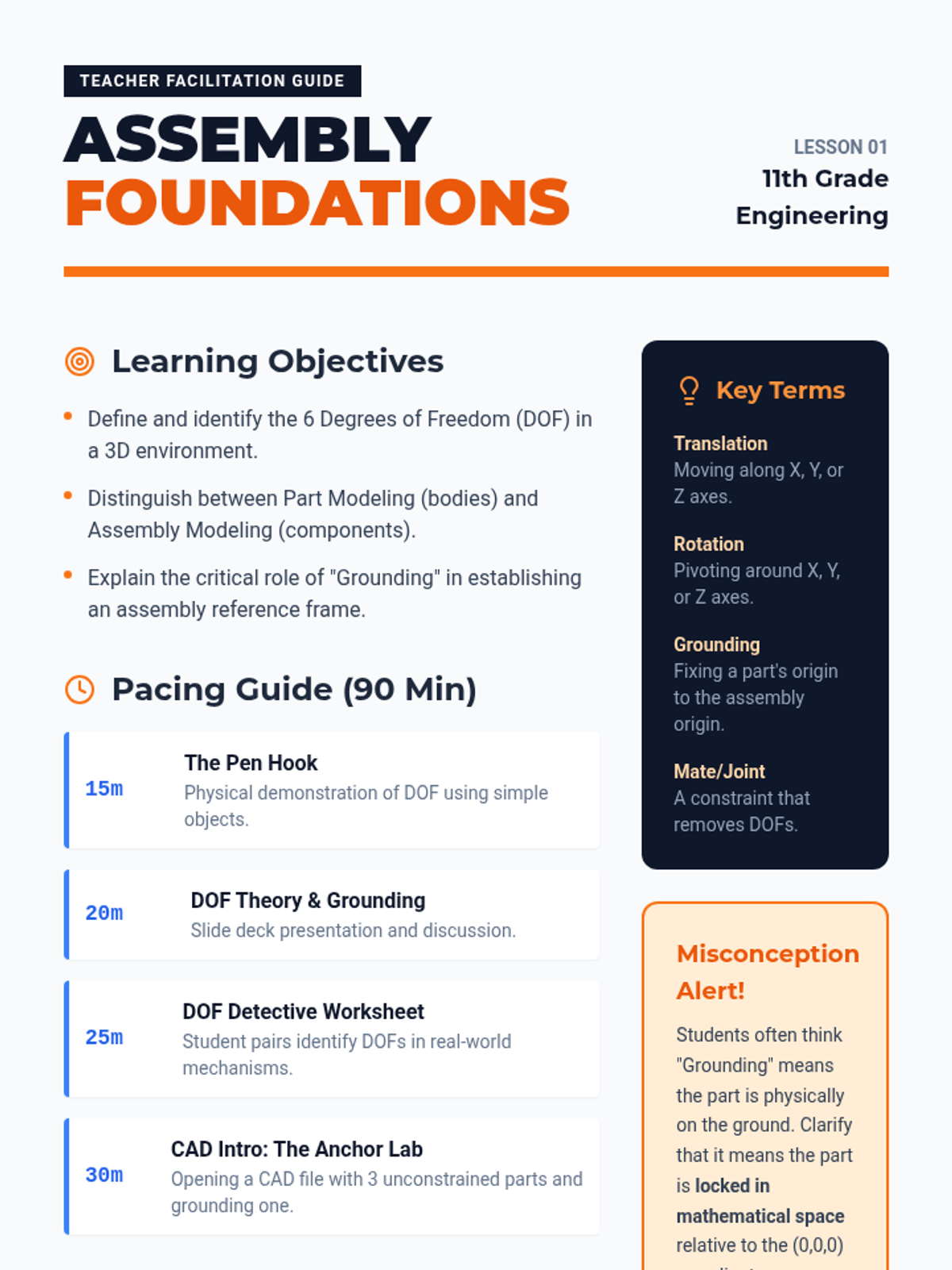 This sequence bridges 3D modeling and professional engineering communication, teaching 11th-grade students to create standardized technical drawings, dimension parts correctly, and organize assembly data. Students will progress from basic orthographic projections to complete engineering drawing packages suitable for real-world manufacturing.