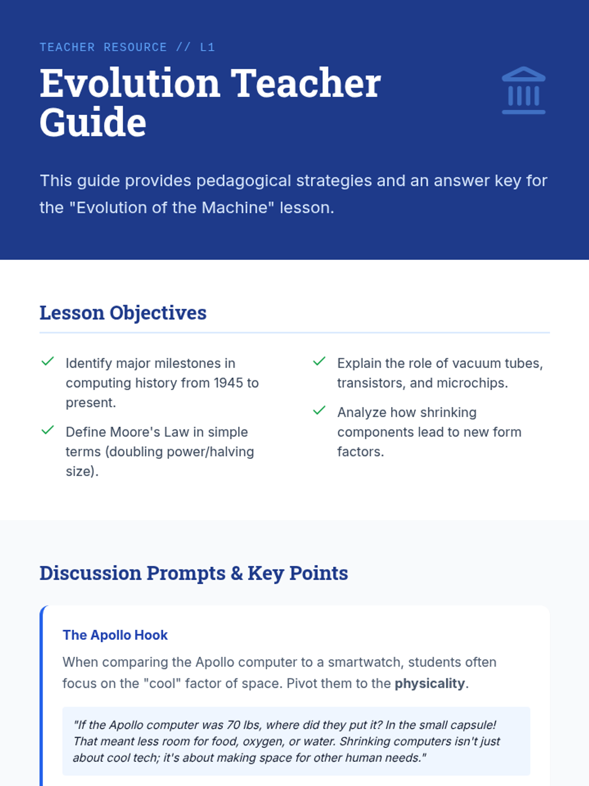 A 5-lesson sequence for 5th graders exploring the evolution, diversity, and design of computing systems, from historical mainframes to modern embedded IoT devices.