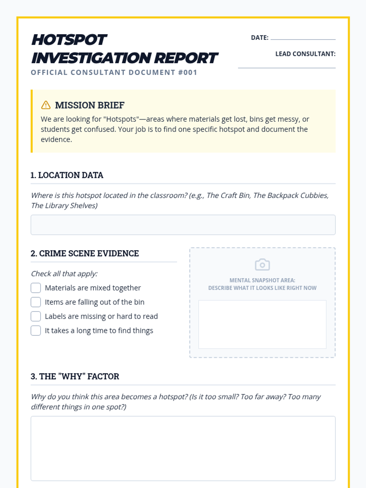 A project-based sequence where 4th-grade students act as classroom consultants to design and implement visual organization systems using labels, shadow boards, and color-coding.