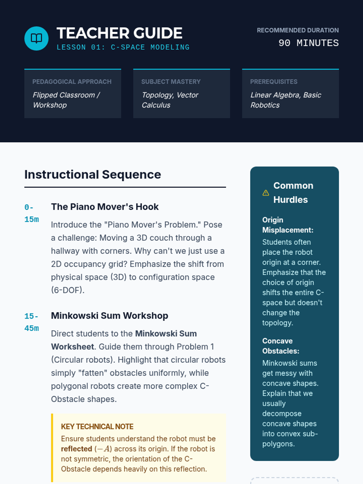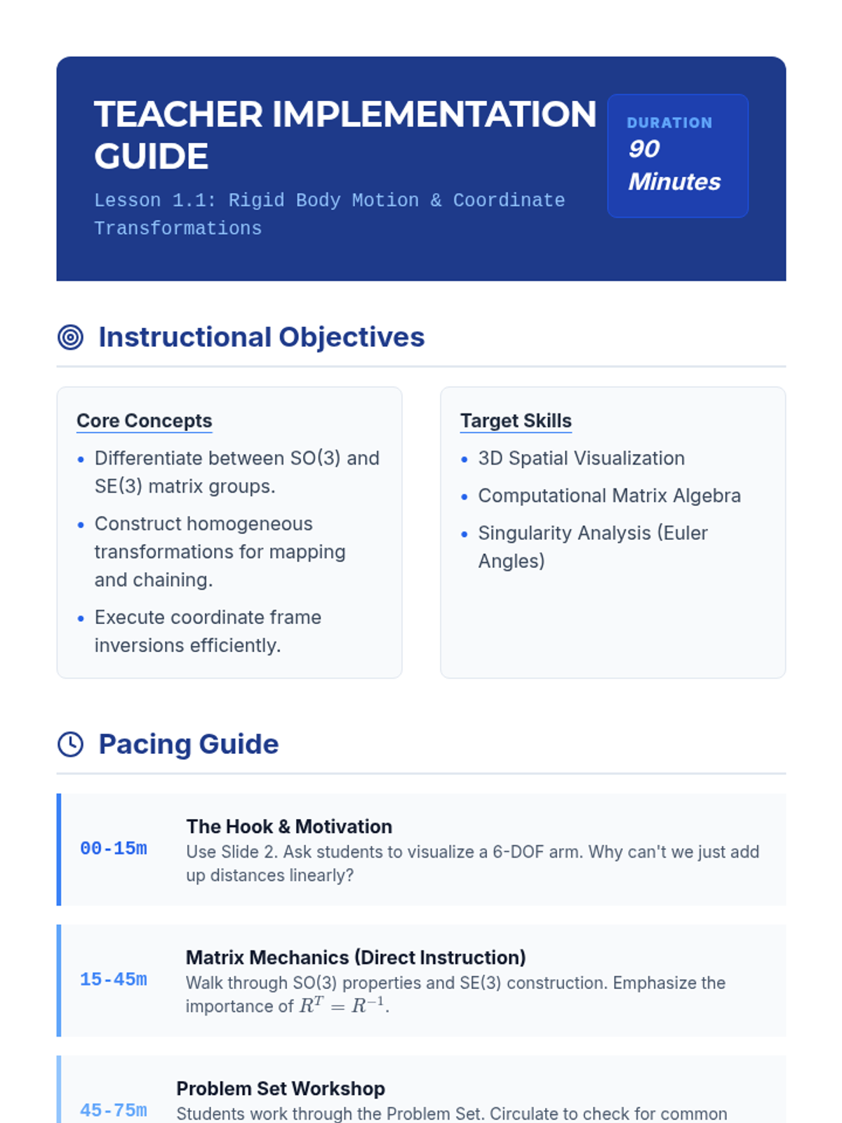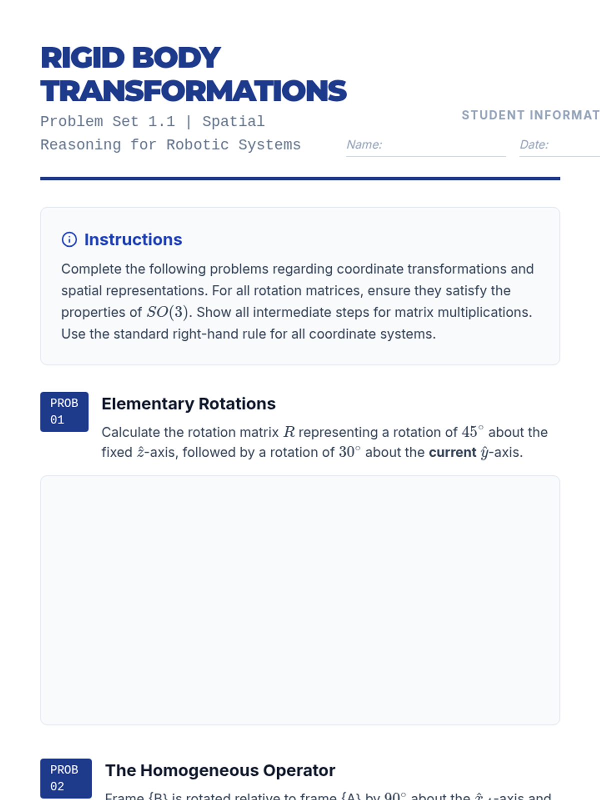 This graduate-level sequence provides a rigorous mathematical foundation for modeling robotic manipulators. It covers spatial transformations, forward and inverse kinematics using DH parameters, differential kinematics via Jacobians, and dynamic modeling through the Euler-Lagrange formulation.