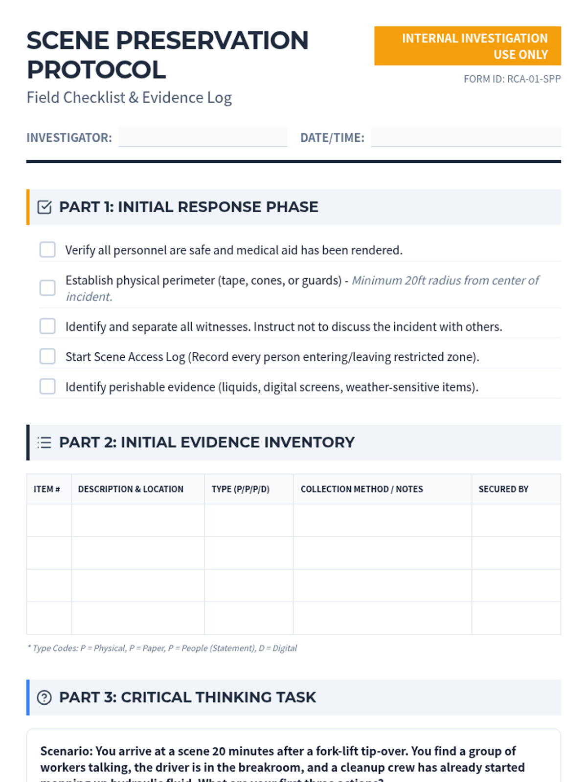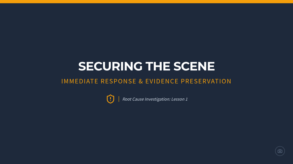 A technical sequence for graduate students focusing on forensic workplace incident investigations. Students move from immediate scene management to advanced root cause analysis and professional technical reporting.