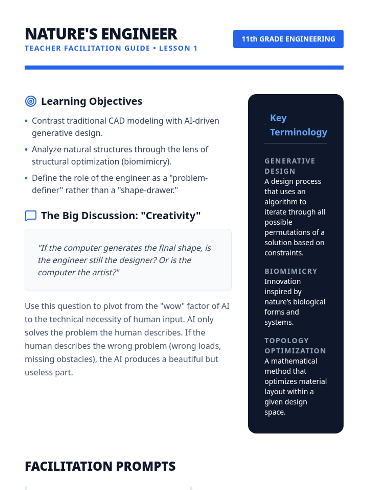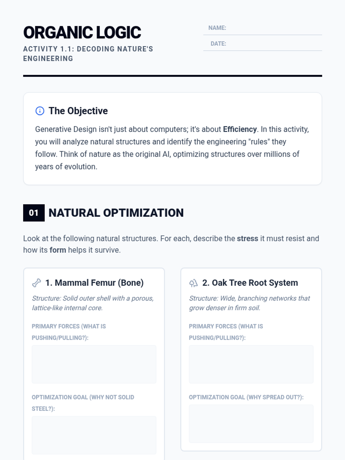 A high-school engineering sequence exploring the intersection of AI and CAD. Students learn to use generative design and topology optimization to create high-performance, organic-looking structures based on physics constraints rather than manual drawing.