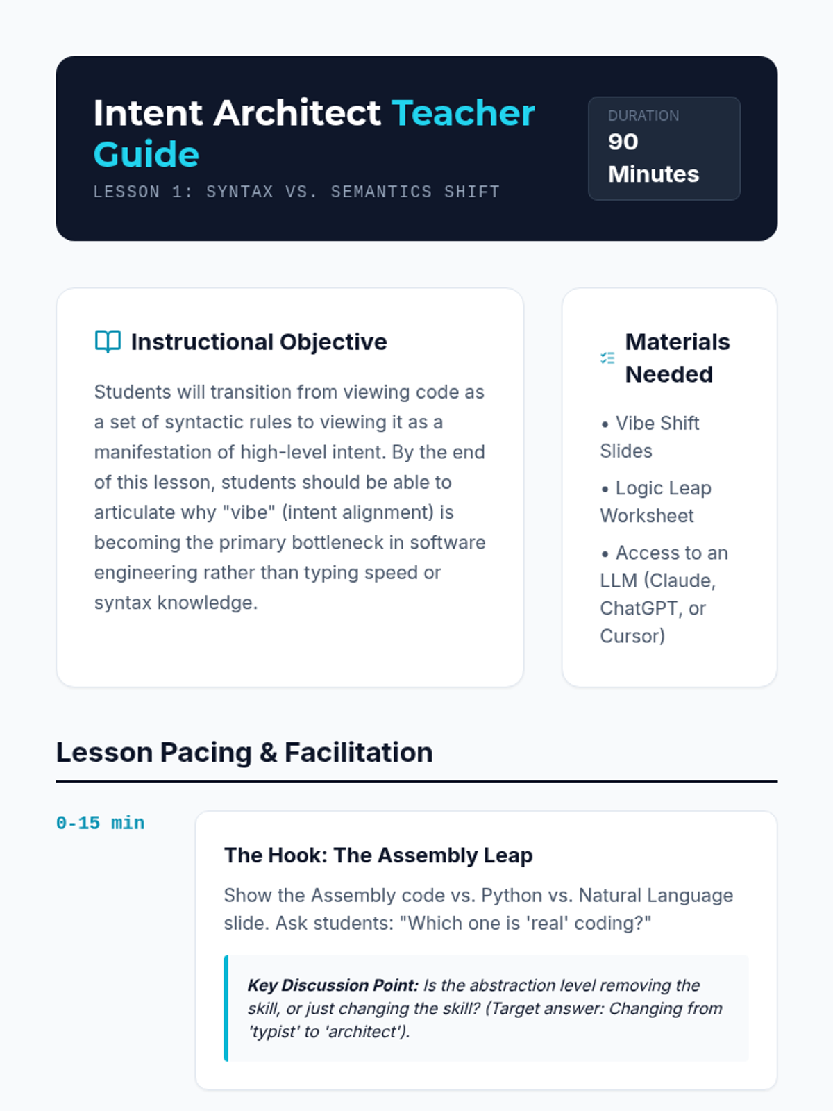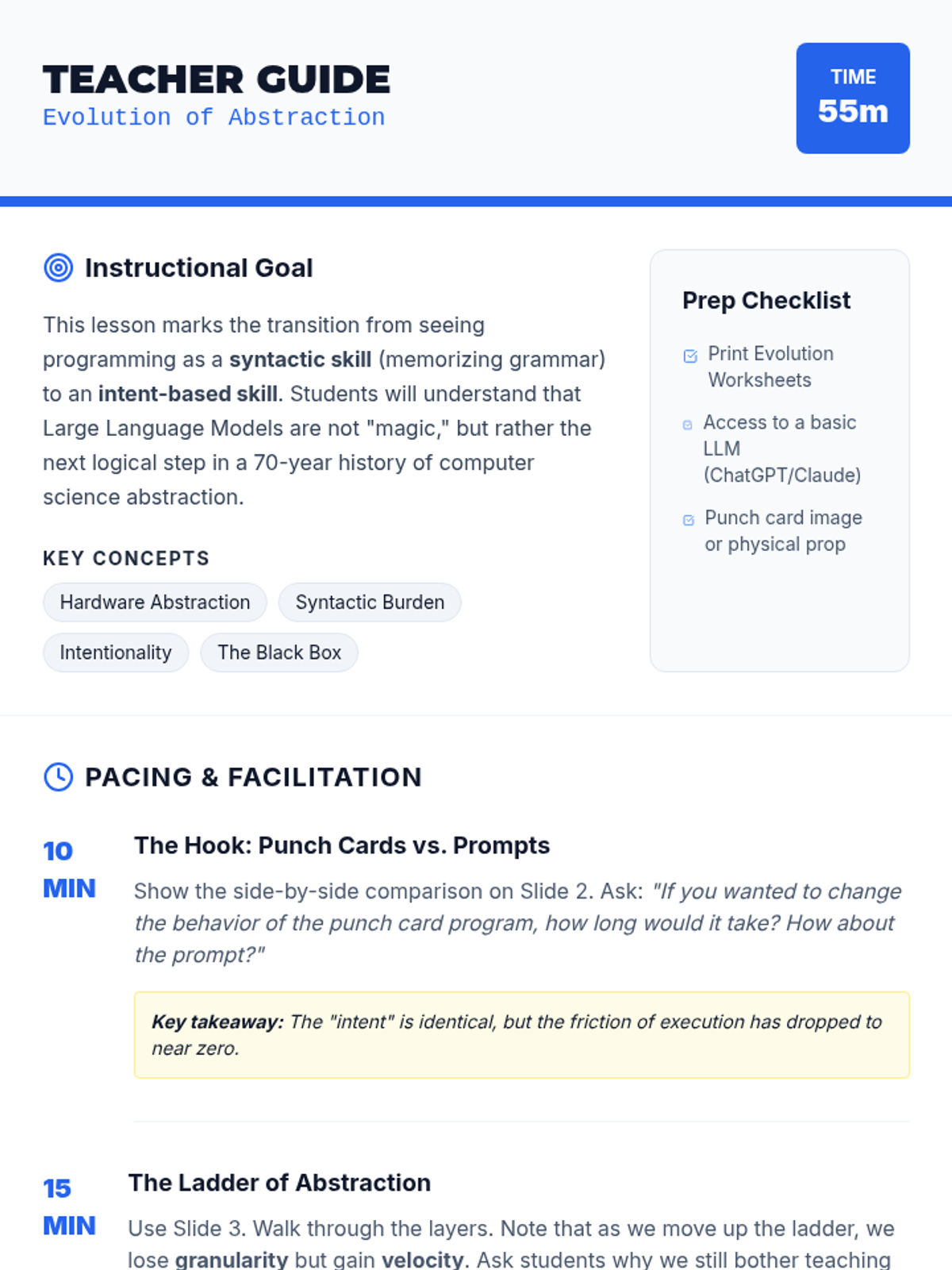 This sequence explores the transition from traditional syntax-based programming to natural language 'vibe coding'. Students will learn about the history of abstraction, computational thinking through decomposition, and the art of prompt engineering to build software with AI.