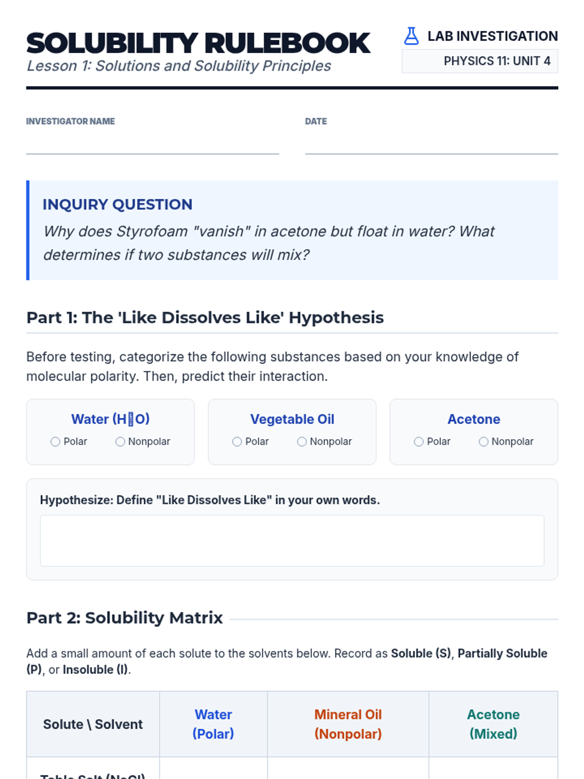 This inquiry-driven sequence moves 11th-grade physics students from visible mixtures to the molecular level of solutions. Using paper and column chromatography as primary tools, students explore solubility, molecular affinity, and quantitative analysis (Rf values) within a forensic context.