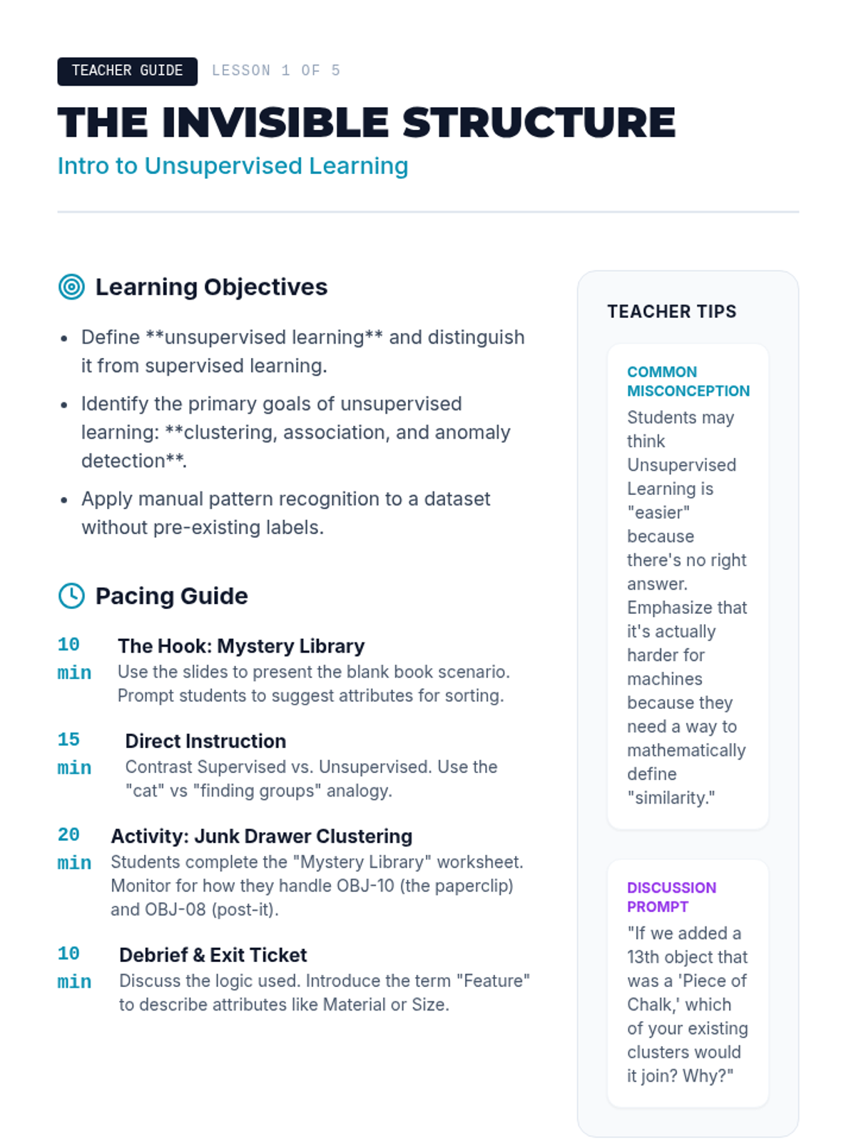 This sequence explores Unsupervised Learning, focusing on how algorithms discover hidden structures in data without human guidance. Students learn about clustering and dimensionality reduction through inquiry-based and project-oriented lessons.