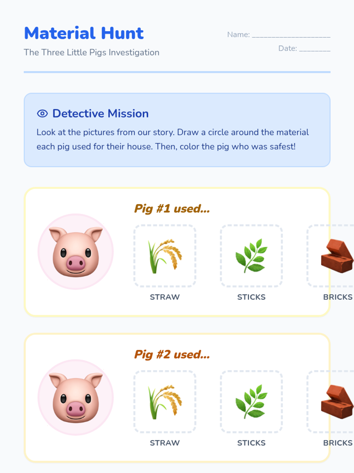 A Kindergarten engineering sequence where students use 'The Three Little Pigs' to explore the properties of materials like straw, wood, and brick, culminating in a construction challenge against a simulated wind force.