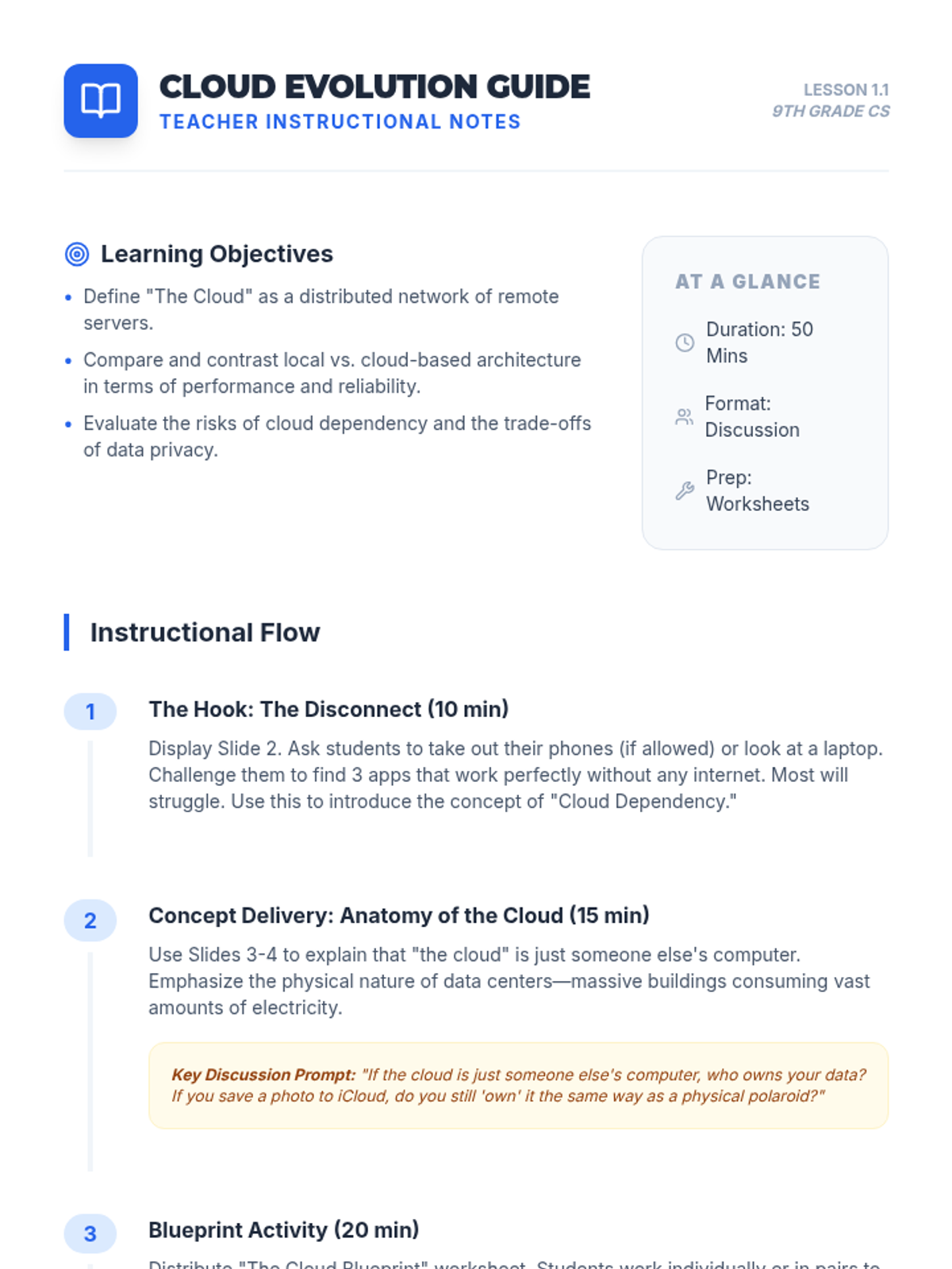 This sequence explores the technical and ethical dimensions of modern networking, from the shift to cloud computing and IoT to the critical societal issues of net neutrality and the digital divide. Students analyze network performance, design secure smart devices, and debate the future of internet equity.