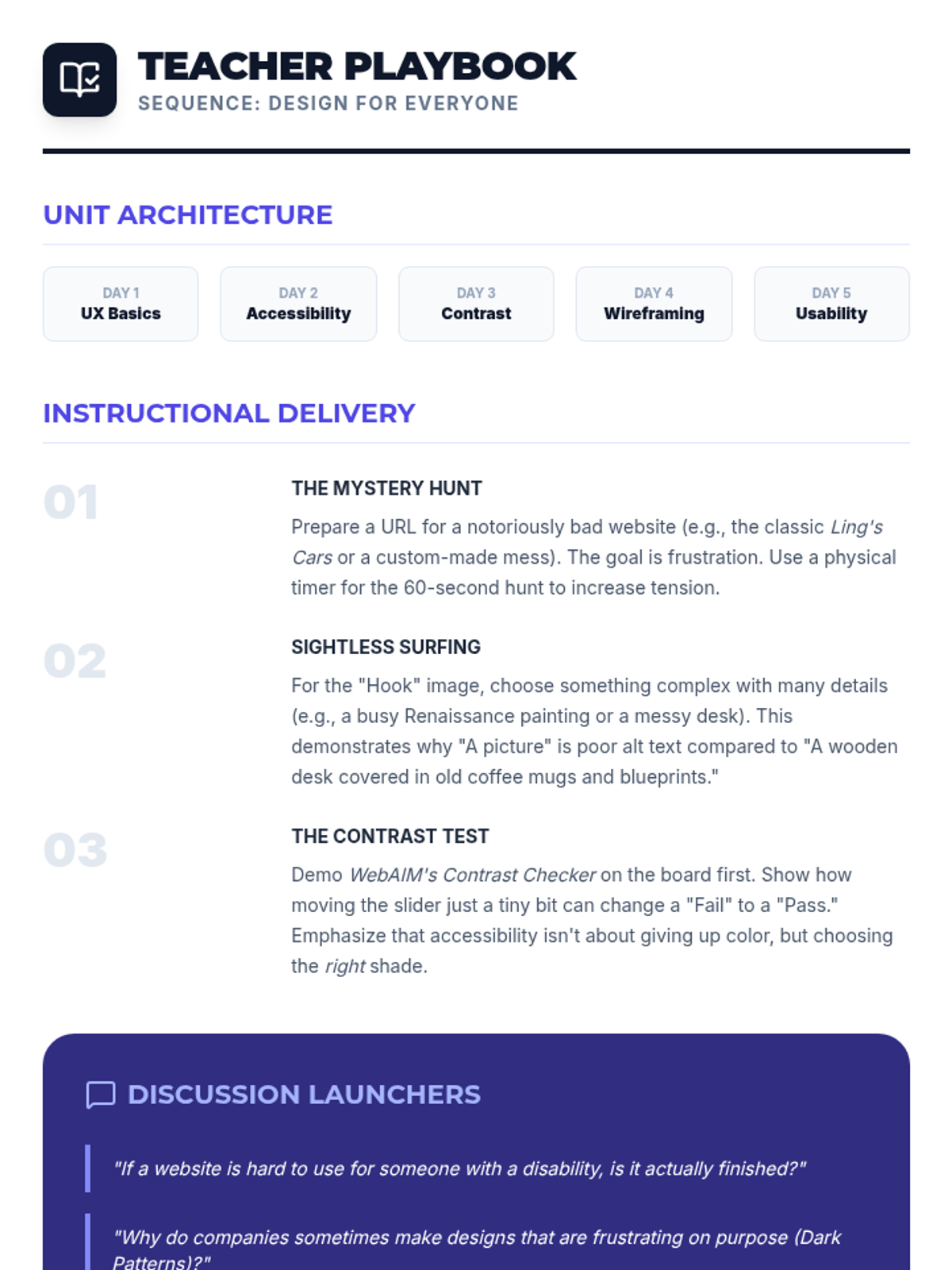 An 11th-grade digital literacy sequence focusing on the principles of User Experience (UX) and Web Accessibility. Students move from theoretical design thinking to practical application of WCAG standards and usability testing.