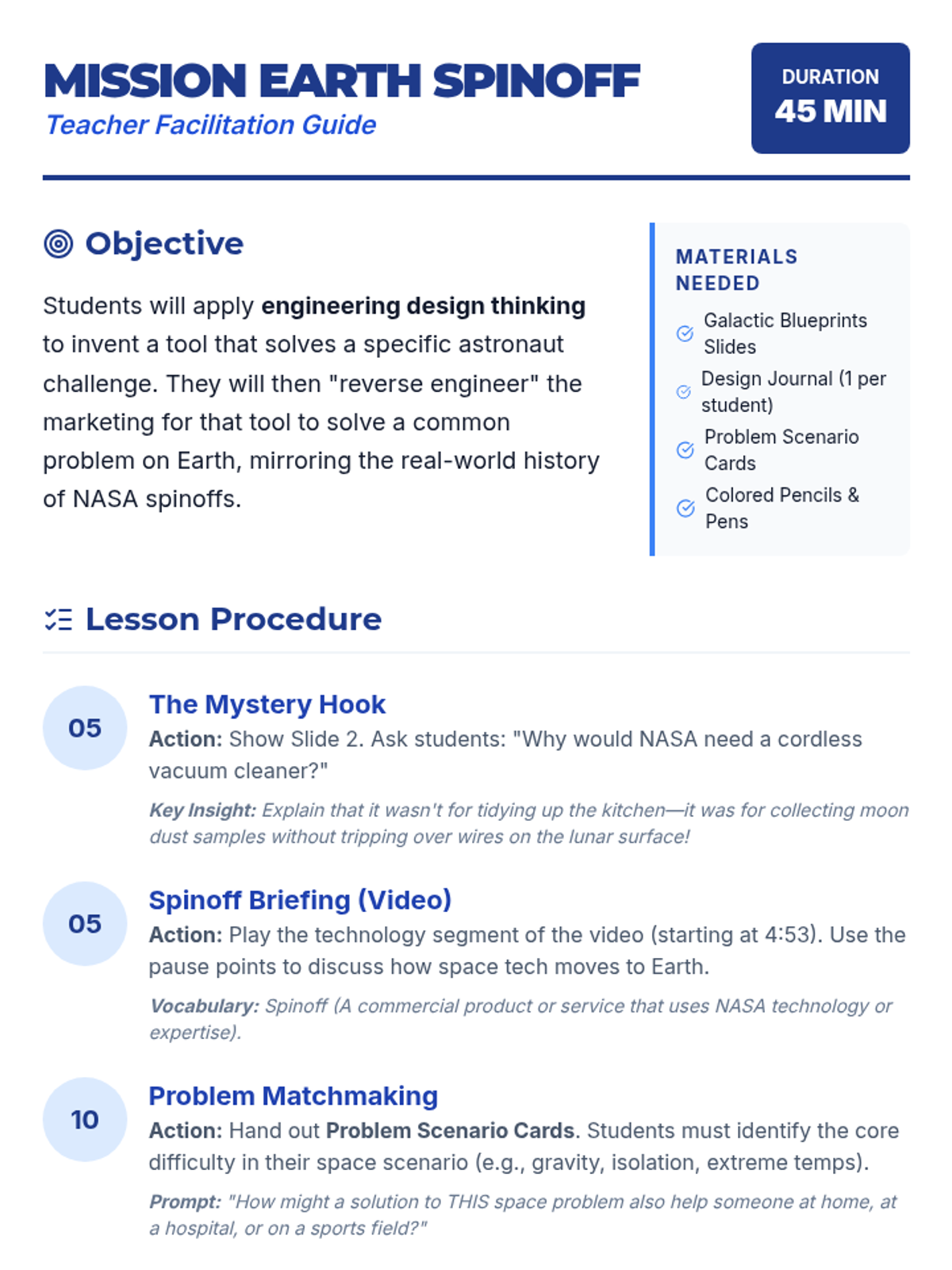 A creative engineering lesson where students explore NASA spinoffs and design their own inventions that solve problems in space and on Earth. Students practice design thinking and marketing by 'reverse engineering' space technology for commercial use.