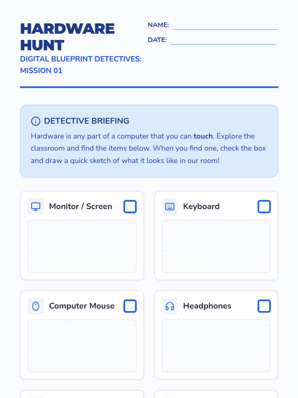 This sequence introduces 2nd-grade students to computing systems, focusing on the distinction between physical hardware and digital software through hands-on activities, scavenger hunts, and design projects.