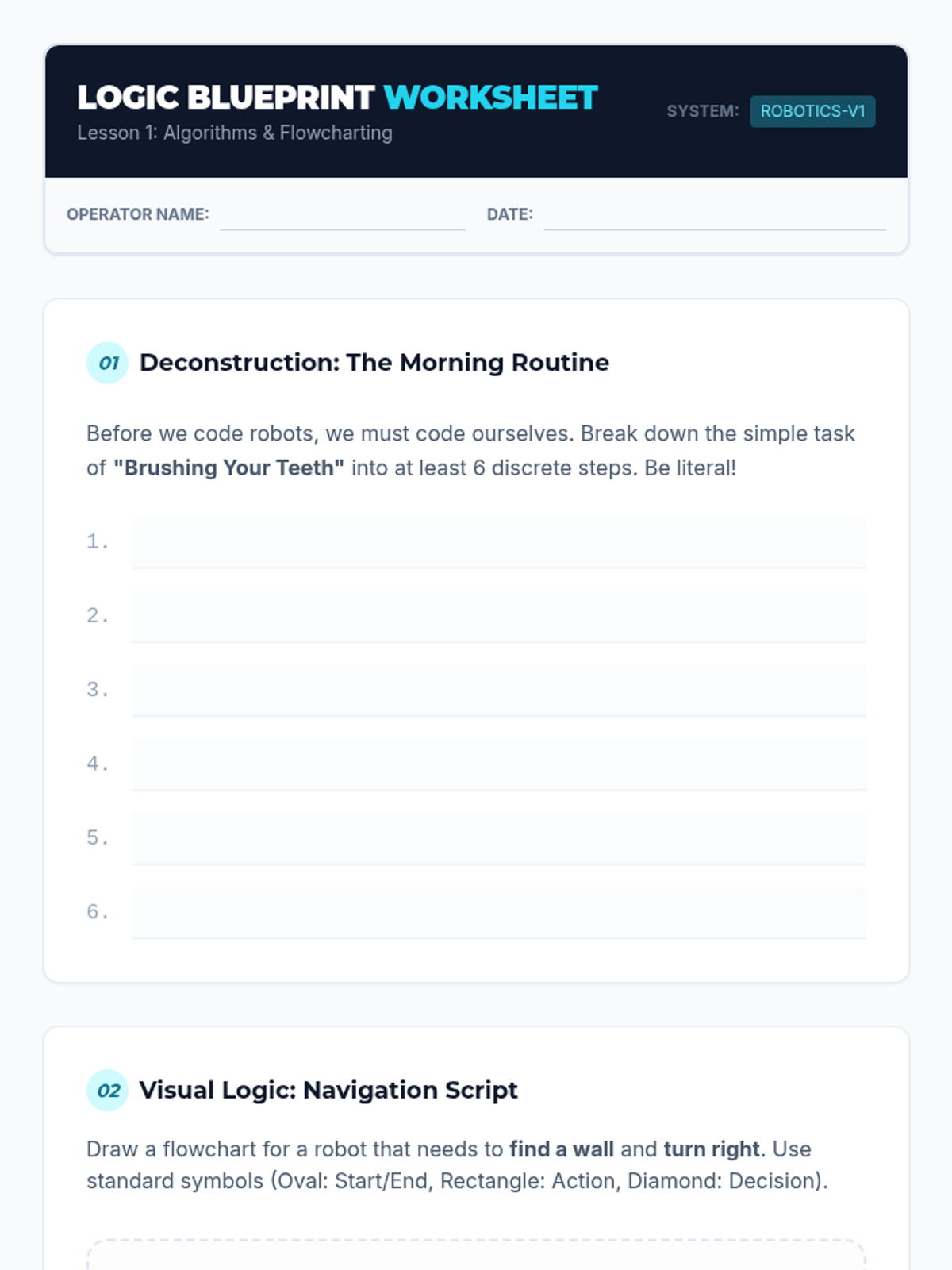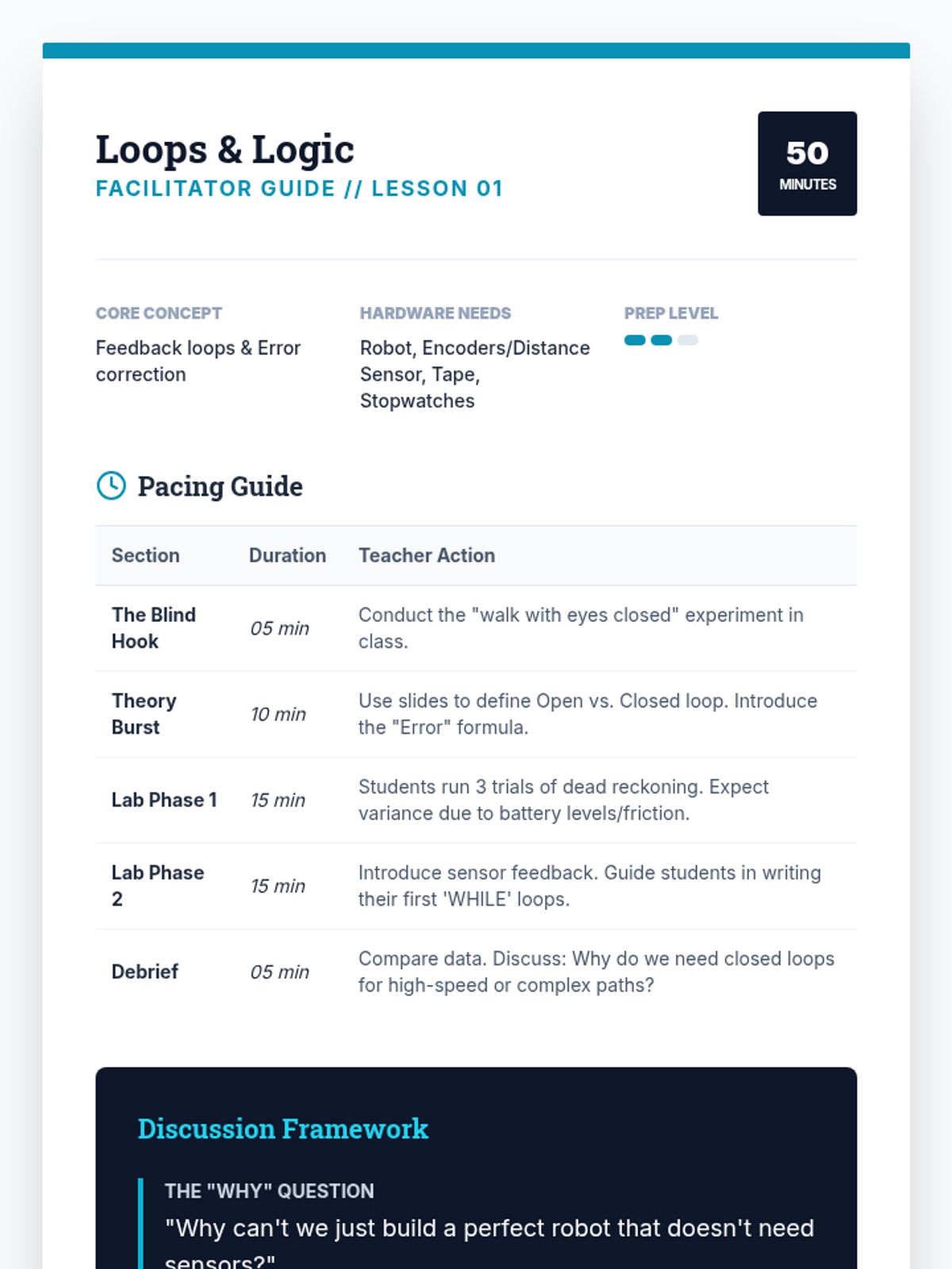 A comprehensive 9th-grade robotics sequence focusing on computational thinking. Students progress from basic algorithmic design and flowcharting to complex control logic, including conditional branching, iterative loops, modular functions, and finite state machines.