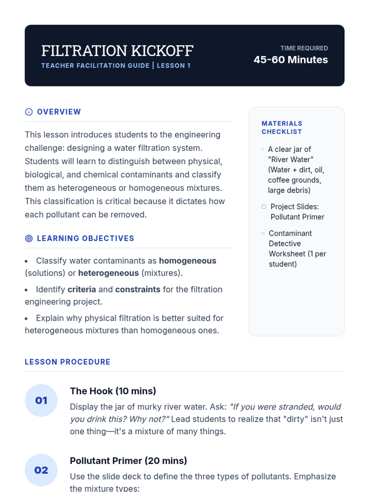 A project-based sequence where 5th-grade students act as environmental engineers to design, build, and test water filtration systems, applying concepts of mixtures and particle size to solve a real-world problem.