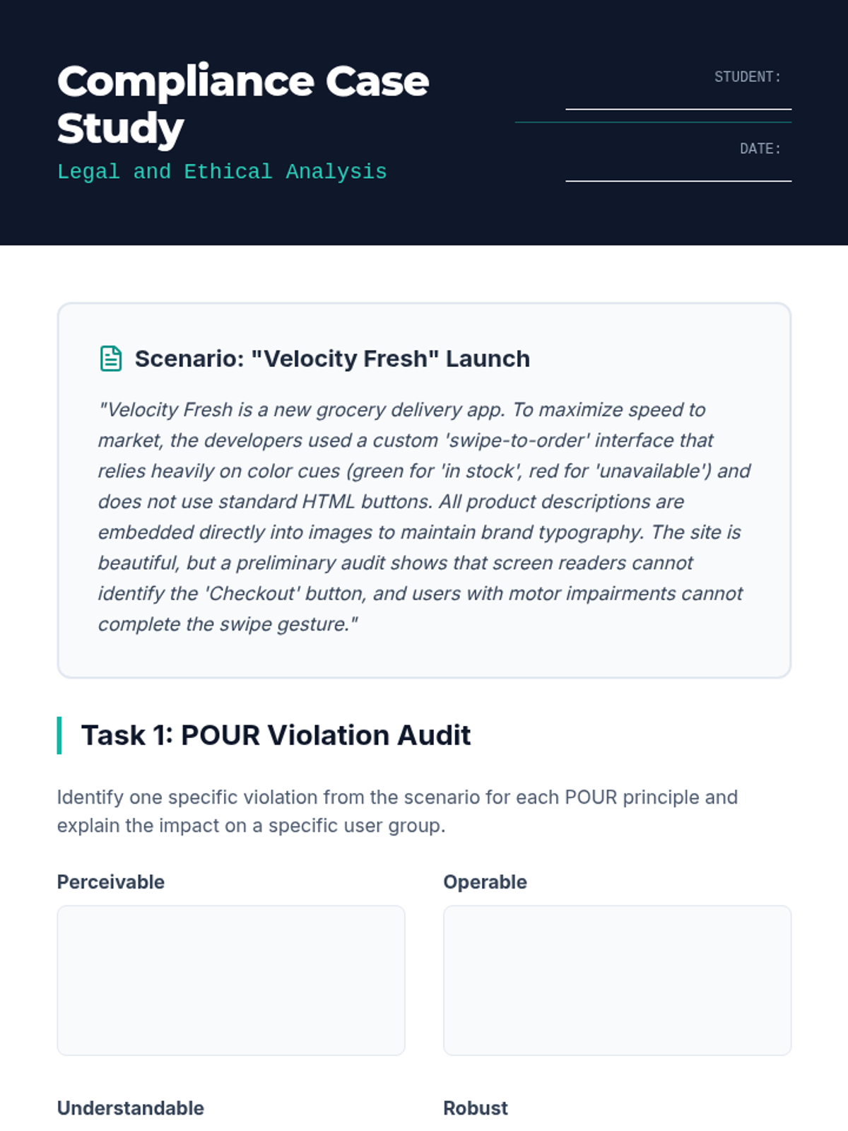 A comprehensive unit on web accessibility focusing on WCAG standards, semantic HTML, ARIA roles, and inclusive design principles. Students move from empathy-building simulations to conducting professional accessibility audits and remediating code to meet international standards.